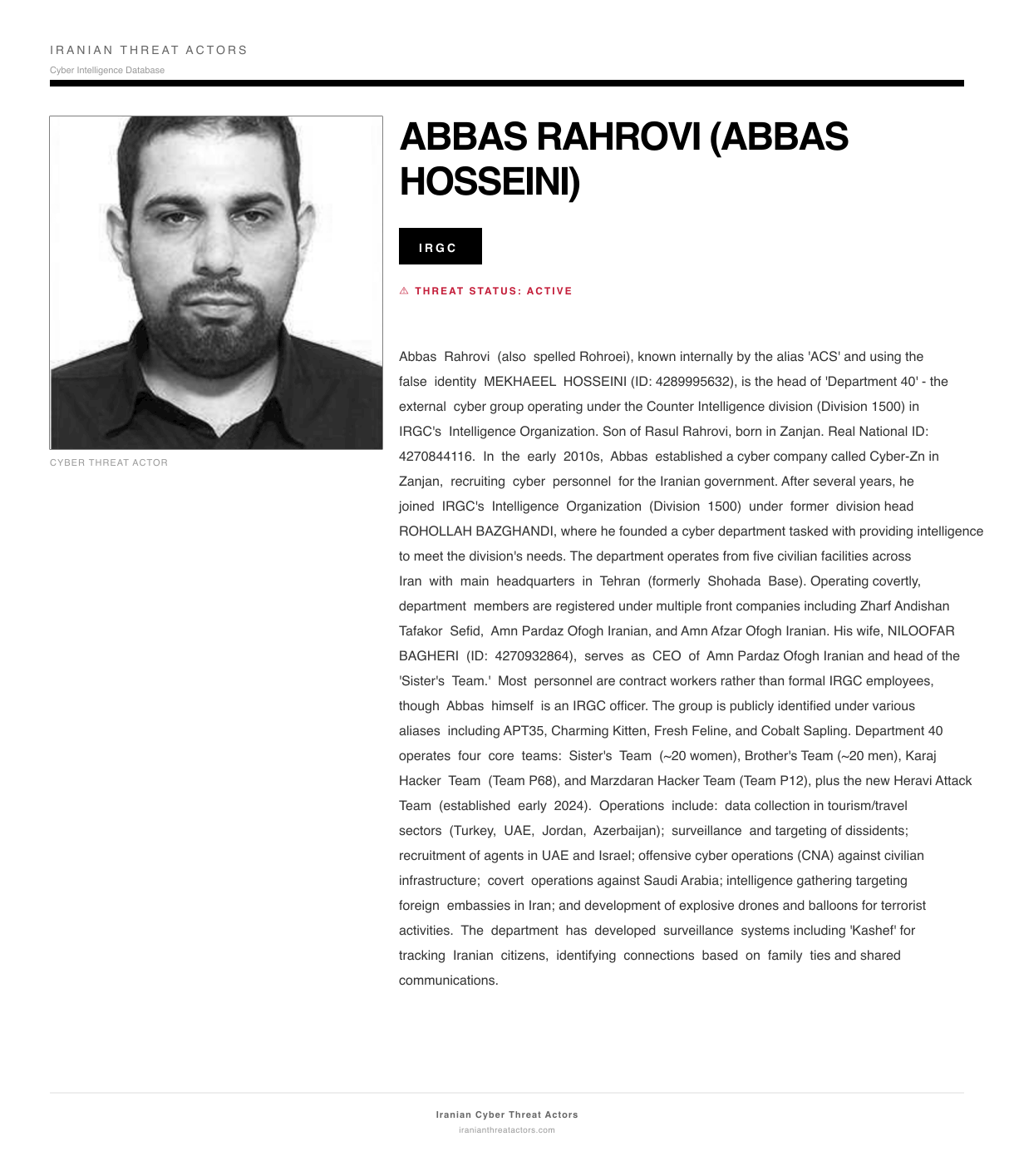 Abbas Rahrovi (also spelled Rohroei), known internally by the alias 'ACS' and using the false identity MEKHAEEL HOSSEINI (ID: 4289995632), is the head of 'Department 40' - the external cyber group operating under the Counter Intelligence division (Division 1500) in IRGC's Intelligence Organization. Son of Rasul Rahrovi, born in Zanjan. Real National ID: 4270844116. In the early 2010s, Abbas established a cyber company called Cyber-Zn in Zanjan, recruiting cyber personnel for the Iranian government. After several years, he joined IRGC's Intelligence Organization (Division 1500) under former division head ROHOLLAH BAZGHANDI, where he founded a cyber department tasked with providing intelligence to meet the division's needs. The department operates from five civilian facilities across Iran with main headquarters in Tehran (formerly Shohada Base). Operating covertly, department members are registered under multiple front companies including Zharf Andishan Tafakor Sefid, Aman Pardaz Ofogh Iranian, and Aman Afzar Ofogh Iranian. His wife, NILOOFAR BAGHERI (ID: 4270932864), serves as CEO of Aman Pardaz Ofogh Iranian and head of the 'Sister's Team.' Most personnel are contract workers rather than formal IRGC employees, though Abbas himself is an IRGC officer. The group is publicly identified under various aliases including APT35, Charming Kitten, Fresh Feline, and Cobalt Sapling. Department 40 operates four core teams: Sister's Team (~20 women), Brother's Team (~20 men), Karaj Hacker Team (Team P68), and Marzdaran Hacker Team (Team P12), plus the new Heravi Attack Team (established early 2024). Operations include: data collection in tourism/travel sectors (Turkey, UAE, Jordan, Azerbaijan); surveillance and targeting of dissidents; recruitment of agents in UAE and Israel; offensive cyber operations (CNA) against civilian infrastructure; covert operations against Saudi Arabia; intelligence gathering targeting foreign embassies in Iran; and development of explosive drones and balloons for terrorist activities. The department has developed surveillance systems including 'Kashef' for tracking Iranian citizens, identifying connections based on family ties and shared communications.