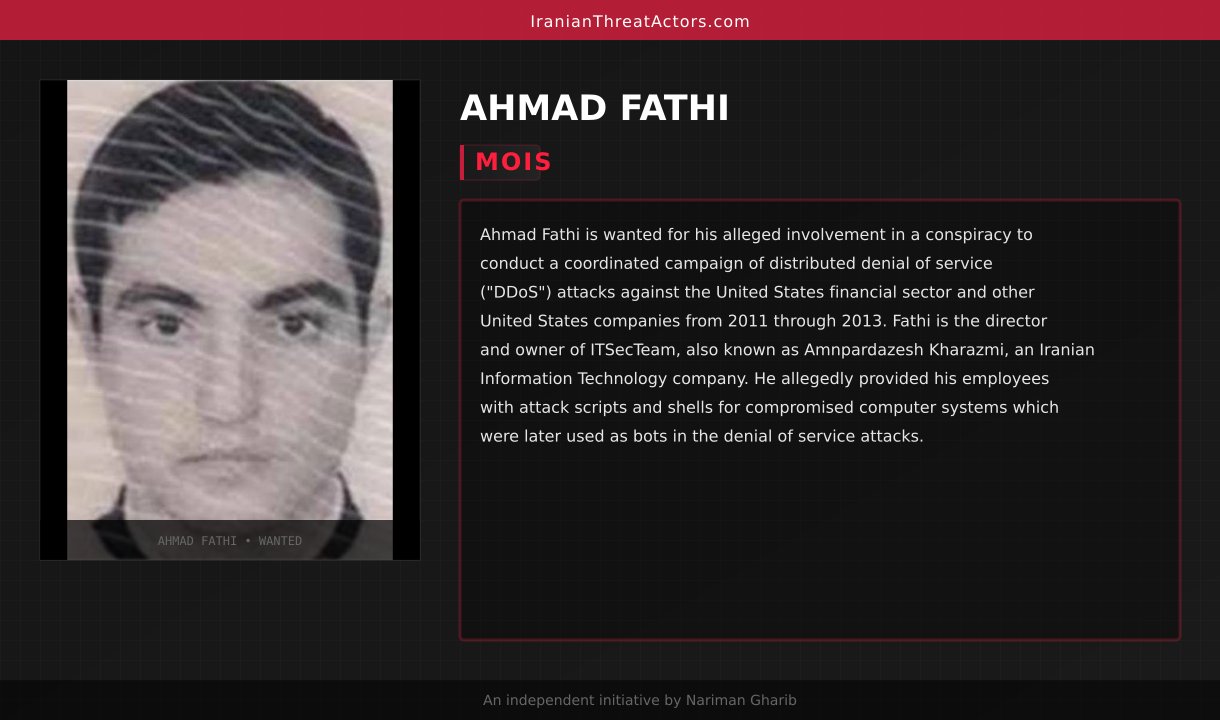 Ahmad Fathi is wanted for his alleged involvement in a conspiracy to conduct a coordinated campaign of distributed denial of service ("DDoS") attacks against the United States financial sector and other United States companies from 2011 through 2013. Fathi is the director and owner of ITSecTeam, also known as Amnpardazesh Kharazmi, an Iranian Information Technology company. He allegedly provided his employees with attack scripts and shells for compromised computer systems which were later used as bots in the denial of service attacks.