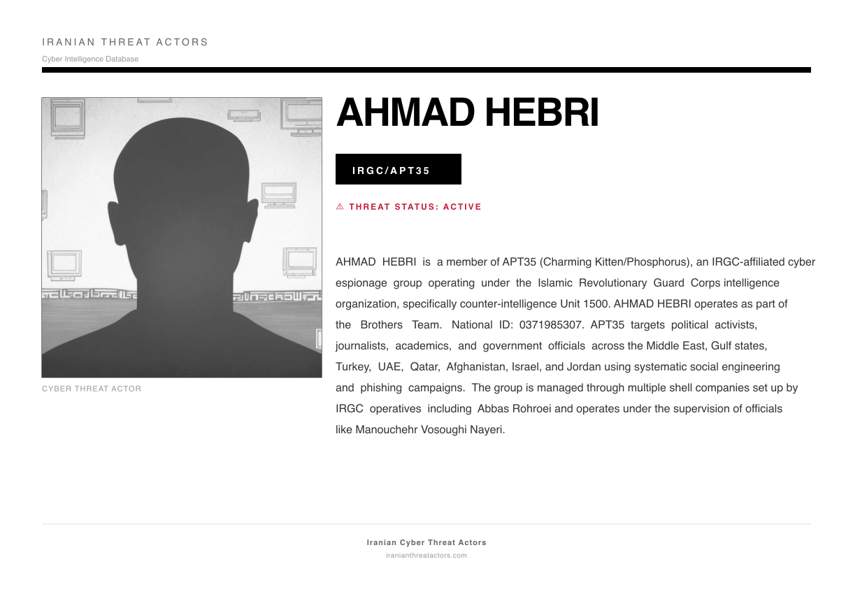 AHMAD HEBRI is a member of APT35 (Charming Kitten/Phosphorus), an IRGC-affiliated cyber espionage group operating under the Islamic Revolutionary Guard Corps intelligence organization, specifically counter-intelligence Unit 1500. AHMAD HEBRI operates as part of the Brothers Team. National ID: 0371985307. APT35 targets political activists, journalists, academics, and government officials across the Middle East, Gulf states, Turkey, UAE, Qatar, Afghanistan, Israel, and Jordan using systematic social engineering and phishing campaigns. The group is managed through multiple shell companies set up by IRGC operatives including Abbas Rohroei and operates under the supervision of officials like Manouchehr Vosoughi Nayeri.