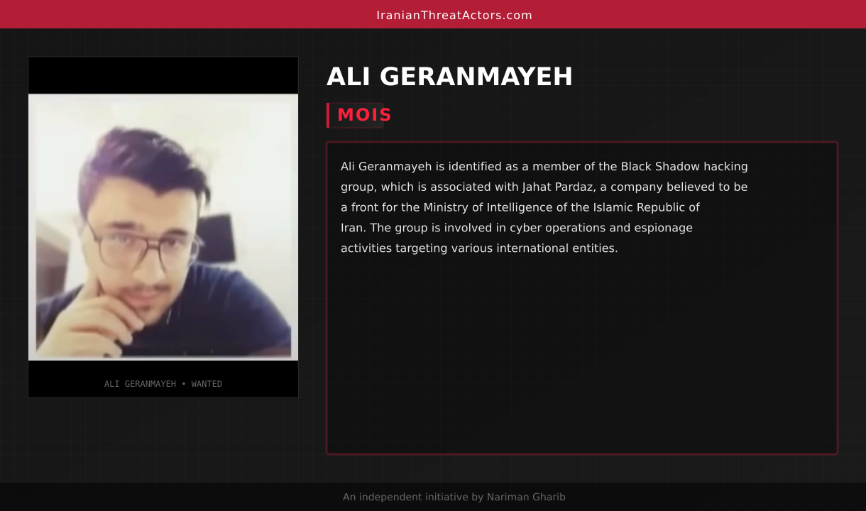 Ali Geranmayeh is identified as a member of the Black Shadow hacking group, which is associated with Jahat Pardaz, a company believed to be a front for the Ministry of Intelligence of the Islamic Republic of Iran. The group is involved in cyber operations and espionage activities targeting various international entities.