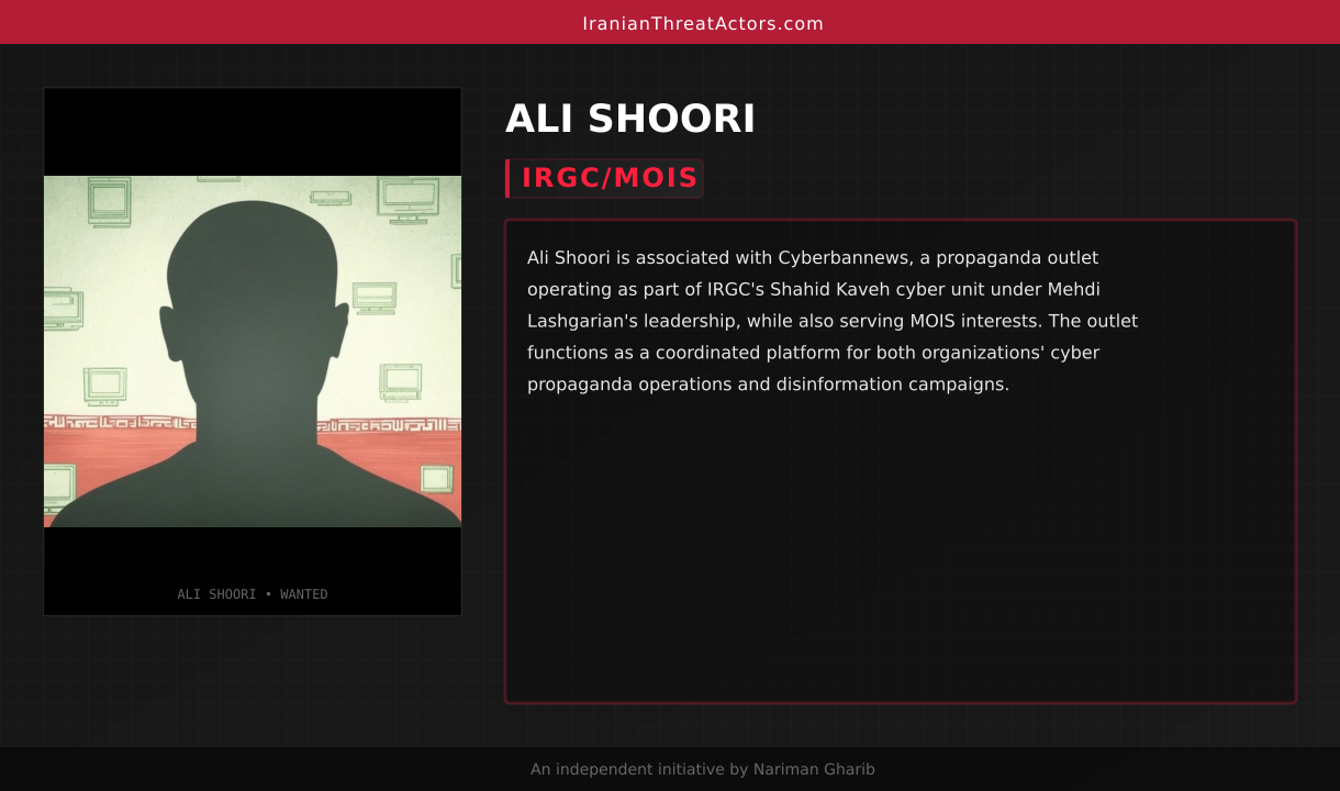 Ali Shoori is associated with Cyberbannews, a propaganda outlet operating as part of IRGC's Shahid Kaveh cyber unit under Mehdi Lashgarian's leadership, while also serving MOIS interests. The outlet functions as a coordinated platform for both organizations' cyber propaganda operations and disinformation campaigns.