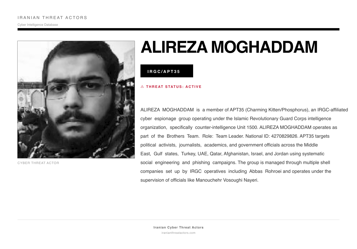 ALIREZA MOGHADDAM is a member of APT35 (Charming Kitten/Phosphorus), an IRGC-affiliated cyber espionage group operating under the Islamic Revolutionary Guard Corps intelligence organization, specifically counter-intelligence Unit 1500. ALIREZA MOGHADDAM operates as part of the Brothers Team. Role: Team Leader. National ID: 4270829826. APT35 targets political activists, journalists, academics, and government officials across the Middle East, Gulf states, Turkey, UAE, Qatar, Afghanistan, Israel, and Jordan using systematic social engineering and phishing campaigns. The group is managed through multiple shell companies set up by IRGC operatives including Abbas Rohroei and operates under the supervision of officials like Manouchehr Vosoughi Nayeri.