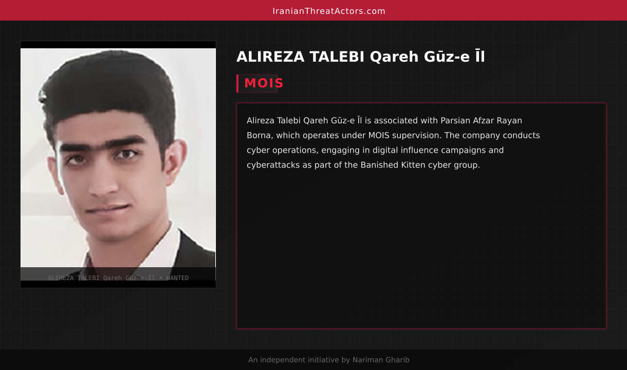 Alireza Talebi Qareh Gūz-e Īl is associated with Parsian Afzar Rayan Borna, which operates under MOIS supervision. The company conducts cyber operations, engaging in digital influence campaigns and cyberattacks as part of the Banished Kitten cyber group.