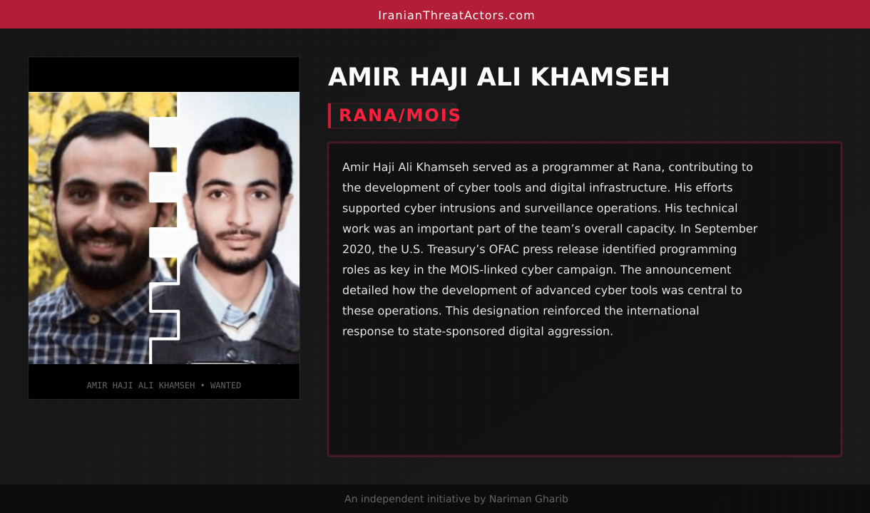 Amir Haji Ali Khamseh served as a programmer at Rana, contributing to the development of cyber tools and digital infrastructure. His efforts supported cyber intrusions and surveillance operations. His technical work was an important part of the team’s overall capacity. In September 2020, the U.S. Treasury’s OFAC press release identified programming roles as key in the MOIS-linked cyber campaign. The announcement detailed how the development of advanced cyber tools was central to these operations. This designation reinforced the international response to state-sponsored digital aggression.