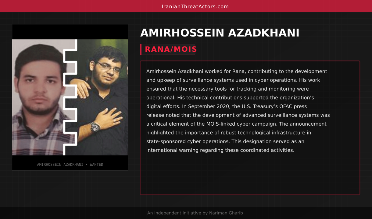 Amirhossein Azadkhani worked for Rana, contributing to the development and upkeep of surveillance systems used in cyber operations. His work ensured that the necessary tools for tracking and monitoring were operational. His technical contributions supported the organization’s digital efforts. In September 2020, the U.S. Treasury’s OFAC press release noted that the development of advanced surveillance systems was a critical element of the MOIS-linked cyber campaign. The announcement highlighted the importance of robust technological infrastructure in state-sponsored cyber operations. This designation served as an international warning regarding these coordinated activities.