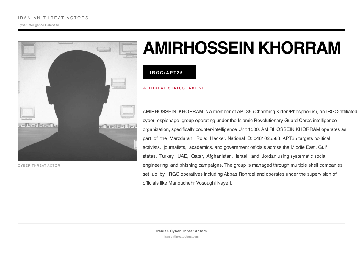 AMIRHOSSEIN KHORRAM is a member of APT35 (Charming Kitten/Phosphorus), an IRGC-affiliated cyber espionage group operating under the Islamic Revolutionary Guard Corps intelligence organization, specifically counter-intelligence Unit 1500. AMIRHOSSEIN KHORRAM operates as part of the Marzdaran. Role: Hacker. National ID: 0481025588. APT35 targets political activists, journalists, academics, and government officials across the Middle East, Gulf states, Turkey, UAE, Qatar, Afghanistan, Israel, and Jordan using systematic social engineering and phishing campaigns. The group is managed through multiple shell companies set up by IRGC operatives including Abbas Rohroei and operates under the supervision of officials like Manouchehr Vosoughi Nayeri.