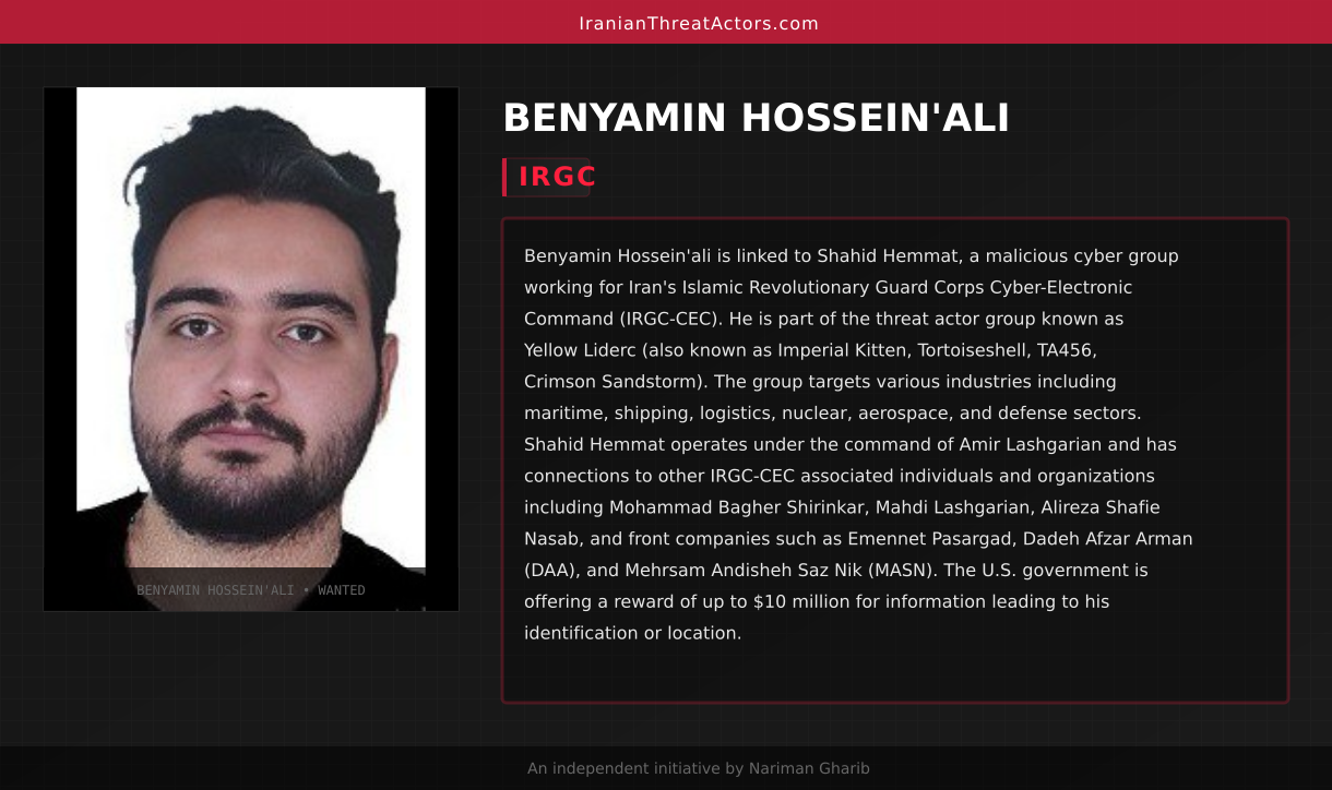 Benyamin Hossein'ali is linked to Shahid Hemmat, a malicious cyber group working for Iran's Islamic Revolutionary Guard Corps Cyber-Electronic Command (IRGC-CEC). He is part of the threat actor group known as Yellow Liderc (also known as Imperial Kitten, Tortoiseshell, TA456, Crimson Sandstorm). The group targets various industries including maritime, shipping, logistics, nuclear, aerospace, and defense sectors. Shahid Hemmat operates under the command of Amir Lashgarian and has connections to other IRGC-CEC associated individuals and organizations including Mohammad Bagher Shirinkar, Mahdi Lashgarian, Alireza Shafie Nasab, and front companies such as Emennet Pasargad, Dadeh Afzar Arman (DAA), and Mehrsam Andisheh Saz Nik (MASN). The U.S. government is offering a reward of up to $10 million for information leading to his identification or location.