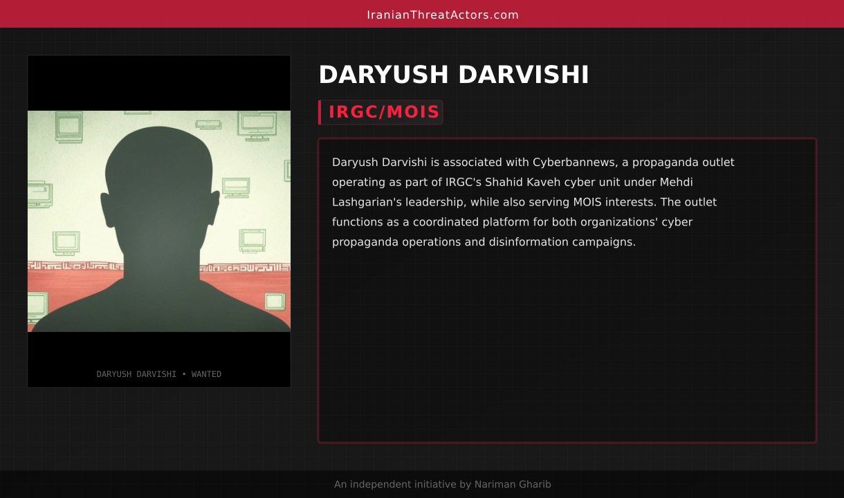 Daryush Darvishi is associated with Cyberbannews, a propaganda outlet operating as part of IRGC's Shahid Kaveh cyber unit under Mehdi Lashgarian's leadership, while also serving MOIS interests. The outlet functions as a coordinated platform for both organizations' cyber propaganda operations and disinformation campaigns.
