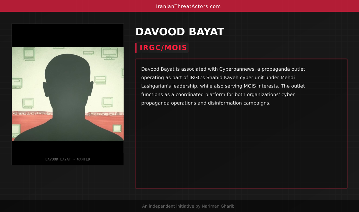 Davood Bayat is associated with Cyberbannews, a propaganda outlet operating as part of IRGC's Shahid Kaveh cyber unit under Mehdi Lashgarian's leadership, while also serving MOIS interests. The outlet functions as a coordinated platform for both organizations' cyber propaganda operations and disinformation campaigns.