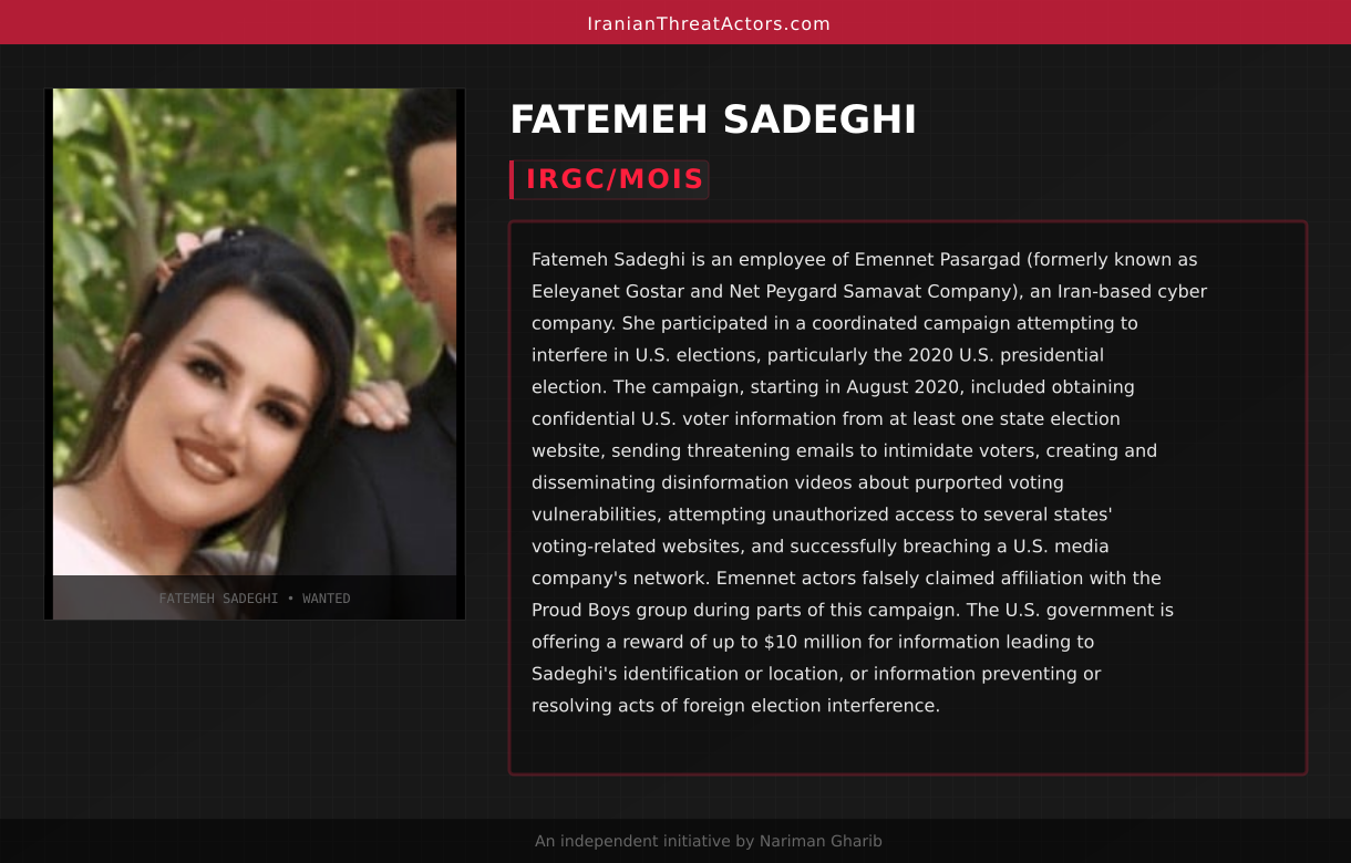 Fatemeh Sadeghi is an employee of Emennet Pasargad (formerly known as Eeleyanet Gostar and Net Peygard Samavat Company), an Iran-based cyber company. She participated in a coordinated campaign attempting to interfere in U.S. elections, particularly the 2020 U.S. presidential election. The campaign, starting in August 2020, included obtaining confidential U.S. voter information from at least one state election website, sending threatening emails to intimidate voters, creating and disseminating disinformation videos about purported voting vulnerabilities, attempting unauthorized access to several states' voting-related websites, and successfully breaching a U.S. media company's network. Emennet actors falsely claimed affiliation with the Proud Boys group during parts of this campaign. The U.S. government is offering a reward of up to $10 million for information leading to Sadeghi's identification or location, or information preventing or resolving acts of foreign election interference.