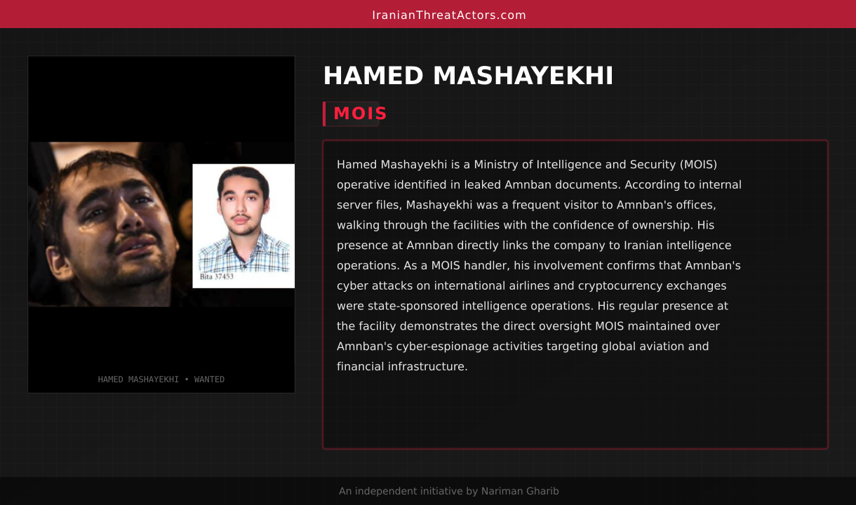 Hamed Mashayekhi is a Ministry of Intelligence and Security (MOIS) operative identified in leaked Amnban documents. According to internal server files, Mashayekhi was a frequent visitor to Amnban's offices, walking through the facilities with the confidence of ownership. His presence at Amnban directly links the company to Iranian intelligence operations. As a MOIS handler, his involvement confirms that Amnban's cyber attacks on international airlines and cryptocurrency exchanges were state-sponsored intelligence operations. His regular presence at the facility demonstrates the direct oversight MOIS maintained over Amnban's cyber-espionage activities targeting global aviation and financial infrastructure.