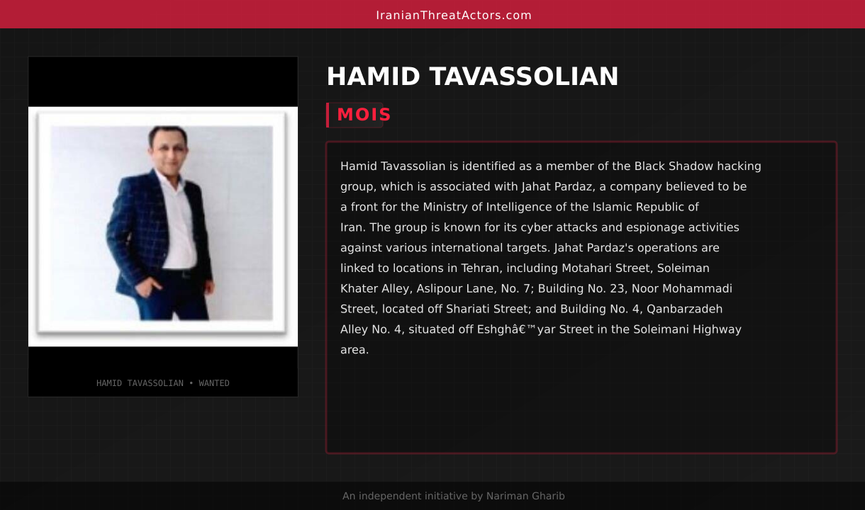 Hamid Tavassolian is identified as a member of the Black Shadow hacking group, which is associated with Jahat Pardaz, a company believed to be a front for the Ministry of Intelligence of the Islamic Republic of Iran. The group is known for its cyber attacks and espionage activities against various international targets. Jahat Pardaz's operations are linked to locations in Tehran, including Motahari Street, Soleiman Khater Alley, Aslipour Lane, No. 7; Building No. 23, Noor Mohammadi Street, located off Shariati Street; and Building No. 4, Qanbarzadeh Alley No. 4, situated off Eshgh’yar Street in the Soleimani Highway area.
