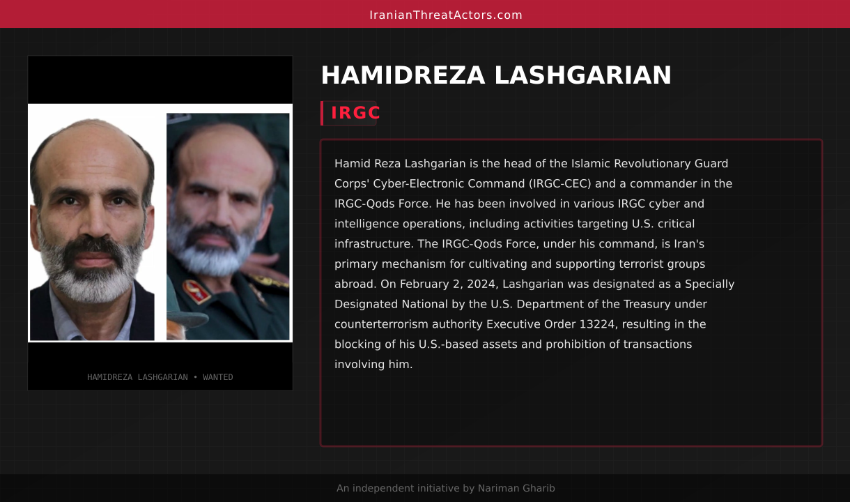 Hamid Reza Lashgarian is the head of the Islamic Revolutionary Guard Corps' Cyber-Electronic Command (IRGC-CEC) and a commander in the IRGC-Qods Force. He has been involved in various IRGC cyber and intelligence operations, including activities targeting U.S. critical infrastructure. The IRGC-Qods Force, under his command, is Iran's primary mechanism for cultivating and supporting terrorist groups abroad. On February 2, 2024, Lashgarian was designated as a Specially Designated National by the U.S. Department of the Treasury under counterterrorism authority Executive Order 13224, resulting in the blocking of his U.S.-based assets and prohibition of transactions involving him.