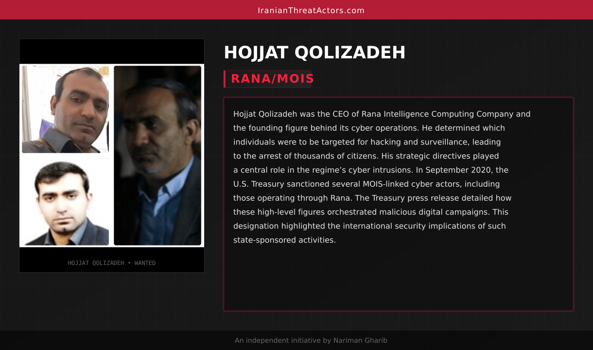 Hojjat Qolizadeh was the CEO of Rana Intelligence Computing Company and the founding figure behind its cyber operations. He determined which individuals were to be targeted for hacking and surveillance, leading to the arrest of thousands of citizens. His strategic directives played a central role in the regime’s cyber intrusions. In September 2020, the U.S. Treasury sanctioned several MOIS-linked cyber actors, including those operating through Rana. The Treasury press release detailed how these high-level figures orchestrated malicious digital campaigns. This designation highlighted the international security implications of such state-sponsored activities.