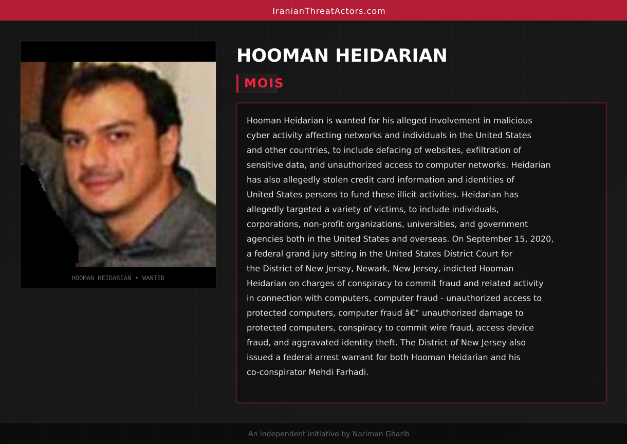 Hooman Heidarian is wanted for his alleged involvement in malicious cyber activity affecting networks and individuals in the United States and other countries, to include defacing of websites, exfiltration of sensitive data, and unauthorized access to computer networks. Heidarian has also allegedly stolen credit card information and identities of United States persons to fund these illicit activities. Heidarian has allegedly targeted a variety of victims, to include individuals, corporations, non-profit organizations, universities, and government agencies both in the United States and overseas. On September 15, 2020, a federal grand jury sitting in the United States District Court for the District of New Jersey, Newark, New Jersey, indicted Hooman Heidarian on charges of conspiracy to commit fraud and related activity in connection with computers, computer fraud - unauthorized access to protected computers, computer fraud – unauthorized damage to protected computers, conspiracy to commit wire fraud, access device fraud, and aggravated identity theft. The District of New Jersey also issued a federal arrest warrant for both Hooman Heidarian and his co-conspirator Mehdi Farhadi.