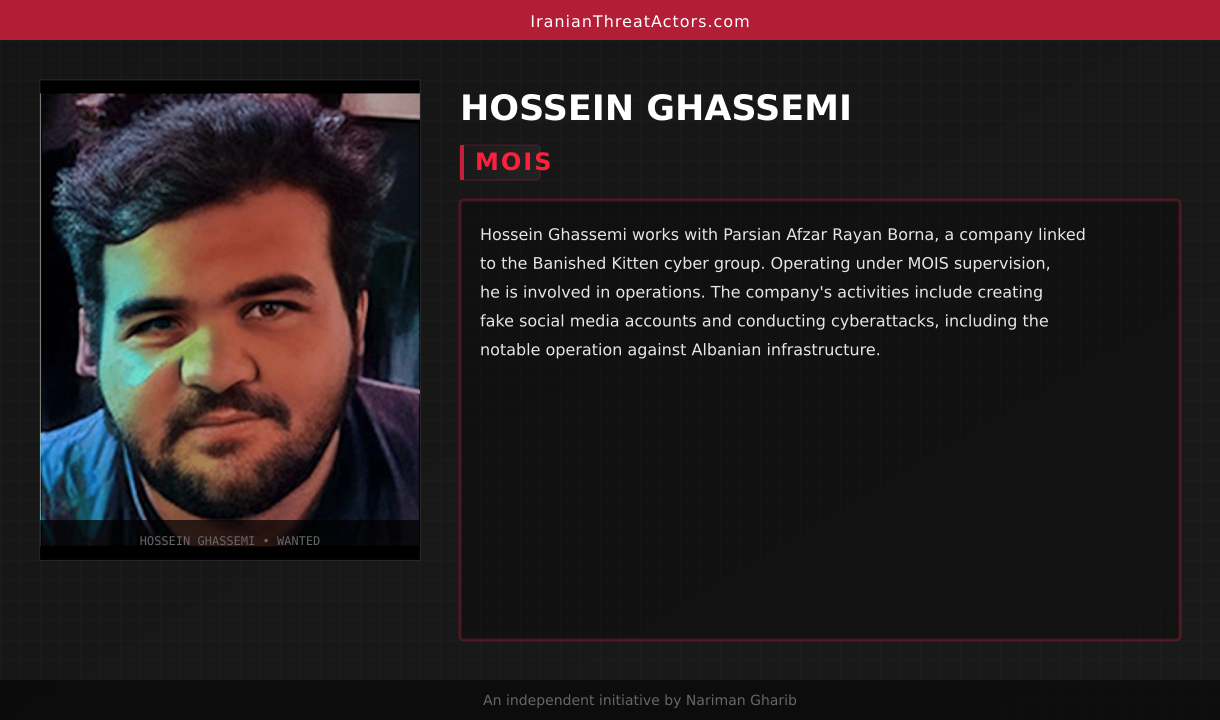 Hossein Ghassemi works with Parsian Afzar Rayan Borna, a company linked to the Banished Kitten cyber group. Operating under MOIS supervision, he is involved in operations. The company's activities include creating fake social media accounts and conducting cyberattacks, including the notable operation against Albanian infrastructure.