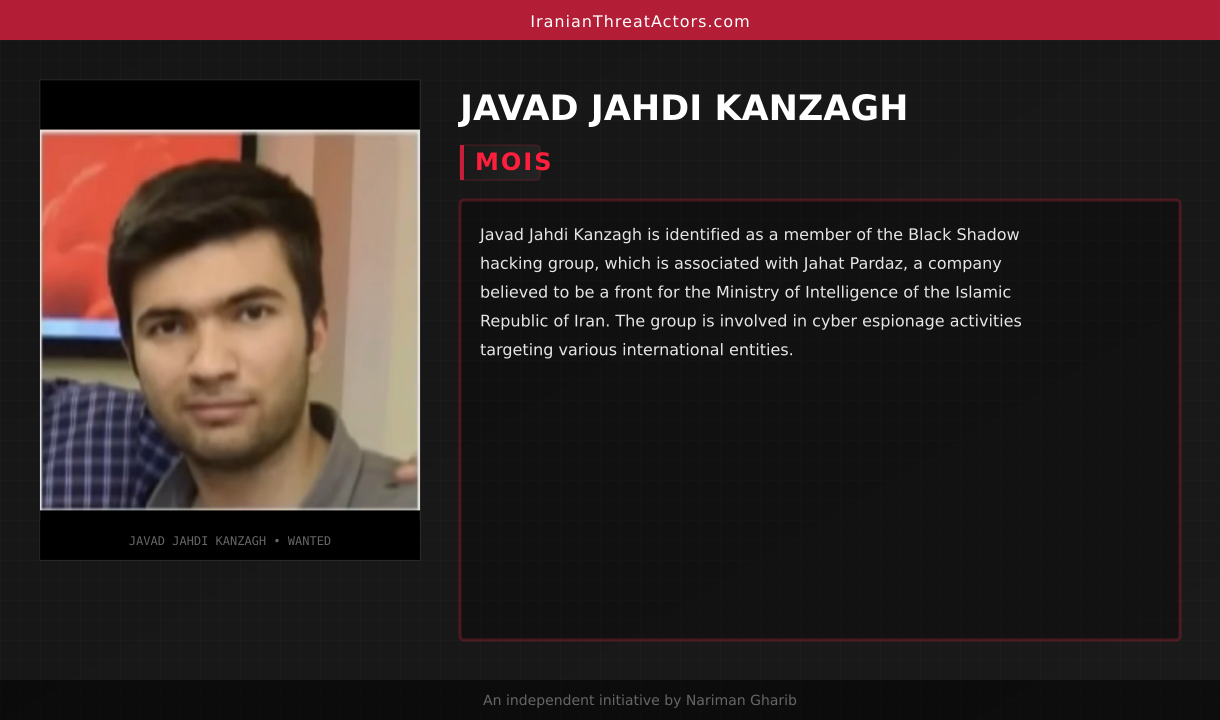 Javad Jahdi Kanzagh is identified as a member of the Black Shadow hacking group, which is associated with Jahat Pardaz, a company believed to be a front for the Ministry of Intelligence of the Islamic Republic of Iran. The group is involved in cyber espionage activities targeting various international entities.