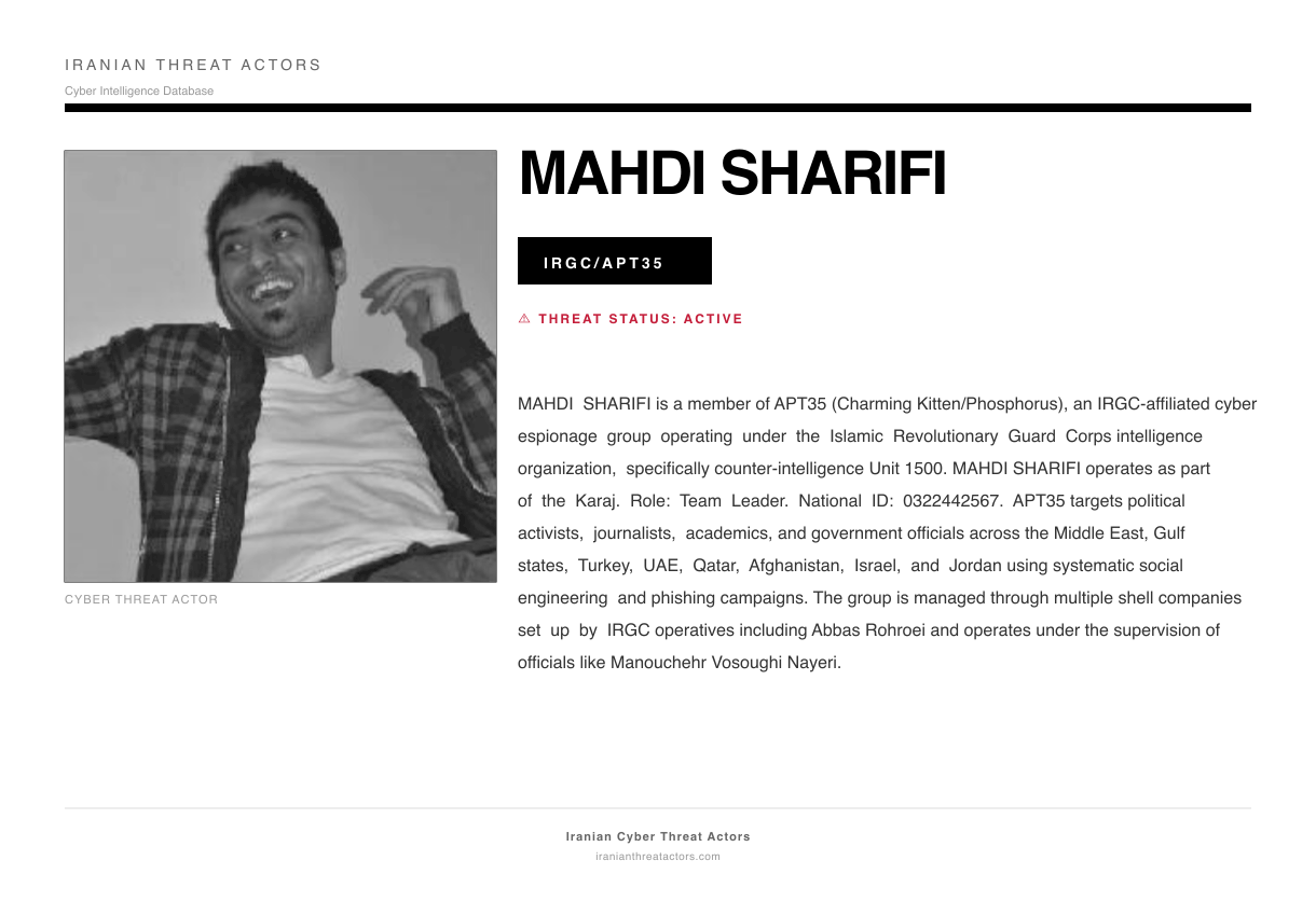 MAHDI SHARIFI is a member of APT35 (Charming Kitten/Phosphorus), an IRGC-affiliated cyber espionage group operating under the Islamic Revolutionary Guard Corps intelligence organization, specifically counter-intelligence Unit 1500. MAHDI SHARIFI operates as part of the Karaj. Role: Team Leader. National ID: 0322442567. APT35 targets political activists, journalists, academics, and government officials across the Middle East, Gulf states, Turkey, UAE, Qatar, Afghanistan, Israel, and Jordan using systematic social engineering and phishing campaigns. The group is managed through multiple shell companies set up by IRGC operatives including Abbas Rohroei and operates under the supervision of officials like Manouchehr Vosoughi Nayeri.