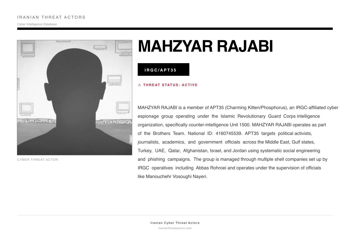 MAHZYAR RAJABI is a member of APT35 (Charming Kitten/Phosphorus), an IRGC-affiliated cyber espionage group operating under the Islamic Revolutionary Guard Corps intelligence organization, specifically counter-intelligence Unit 1500. MAHZYAR RAJABI operates as part of the Brothers Team. National ID: 4160745539. APT35 targets political activists, journalists, academics, and government officials across the Middle East, Gulf states, Turkey, UAE, Qatar, Afghanistan, Israel, and Jordan using systematic social engineering and phishing campaigns. The group is managed through multiple shell companies set up by IRGC operatives including Abbas Rohroei and operates under the supervision of officials like Manouchehr Vosoughi Nayeri.
