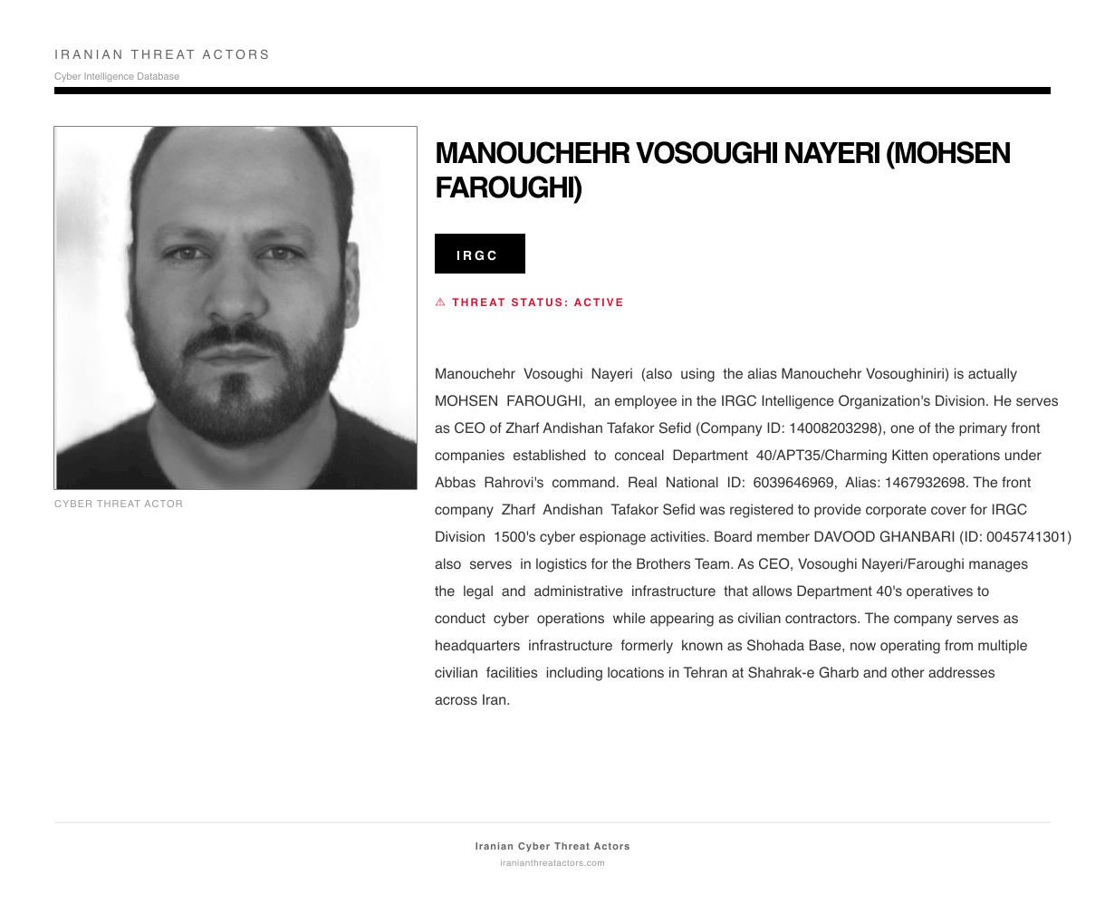Manouchehr Vosoughi Nayeri (also using the alias Manouchehr Vosoughiniri) is actually MOHSEN FAROUGHI, an employee in the IRGC Intelligence Organization's Division. He serves as CEO of Zharf Andishan Tafakor Sefid (Company ID: 14008203298), one of the primary front companies established to conceal Department 40/APT35/Charming Kitten operations under Abbas Rahrovi's command. Real National ID: 6039646969, Alias: 1467932698. The front company Zharf Andishan Tafakor Sefid was registered to provide corporate cover for IRGC Division 1500's cyber espionage activities. Board member DAVOOD GHANBARI (ID: 0045741301) also serves in logistics for the Brothers Team. As CEO, Vosoughi Nayeri/Faroughi manages the legal and administrative infrastructure that allows Department 40's operatives to conduct cyber operations while appearing as civilian contractors. The company serves as headquarters infrastructure formerly known as Shohada Base, now operating from multiple civilian facilities including locations in Tehran at Shahrak-e Gharb and other addresses across Iran.