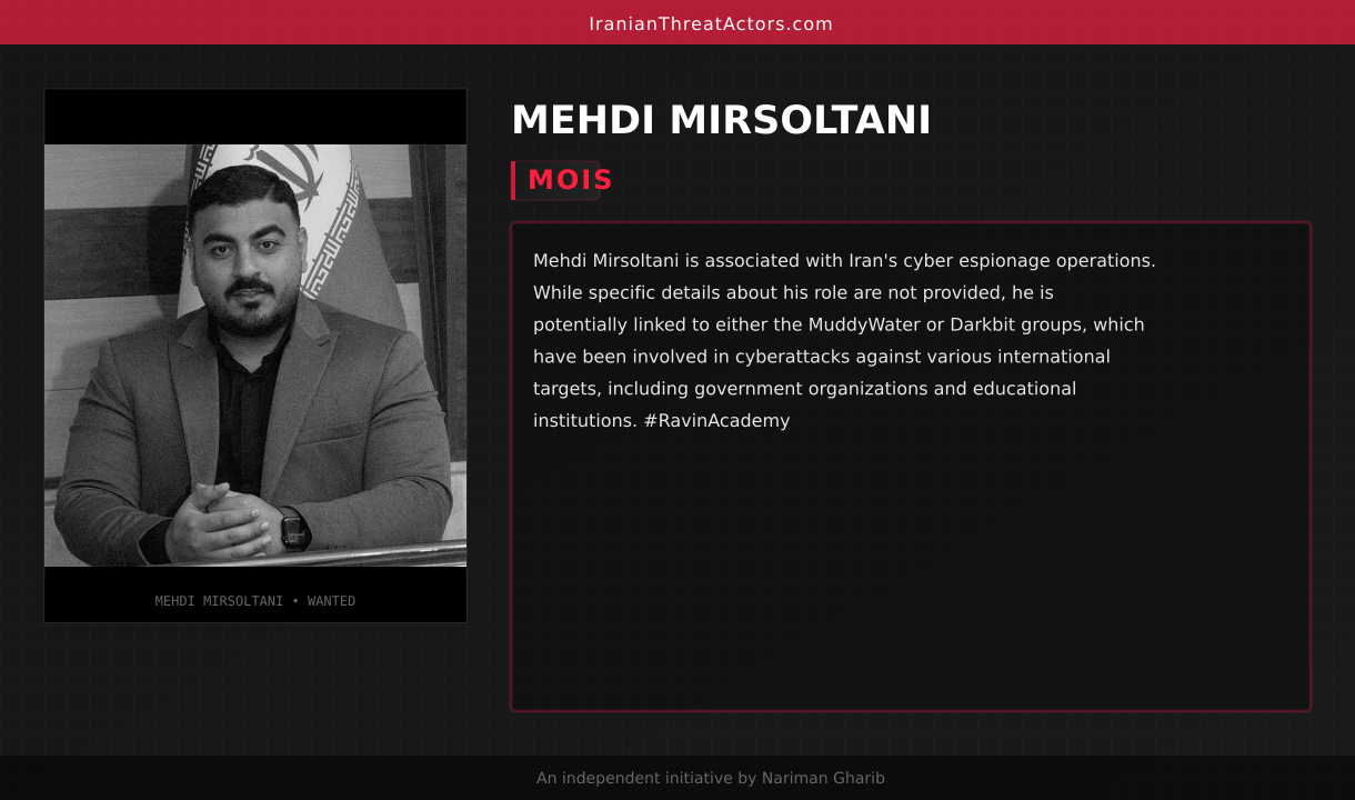 Mehdi Mirsoltani is associated with Iran's cyber espionage operations. While specific details about his role are not provided, he is potentially linked to either the MuddyWater or Darkbit groups, which have been involved in cyberattacks against various international targets, including government organizations and educational institutions. #RavinAcademy