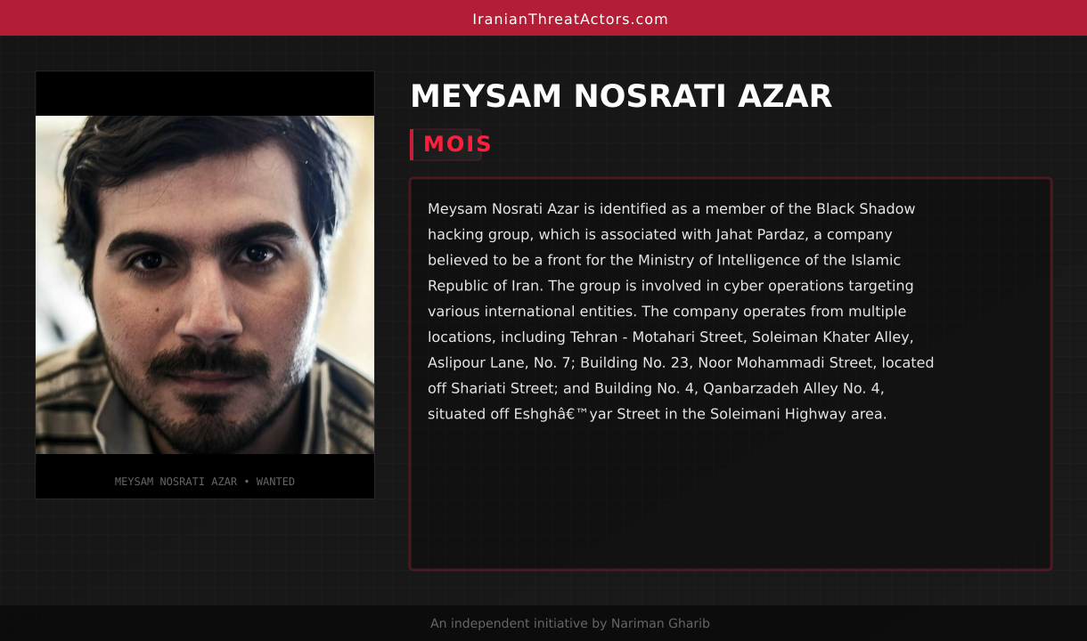 Meysam Nosrati Azar is identified as a member of the Black Shadow hacking group, which is associated with Jahat Pardaz, a company believed to be a front for the Ministry of Intelligence of the Islamic Republic of Iran. The group is involved in cyber operations targeting various international entities. The company operates from multiple locations, including Tehran - Motahari Street, Soleiman Khater Alley, Aslipour Lane, No. 7; Building No. 23, Noor Mohammadi Street, located off Shariati Street; and Building No. 4, Qanbarzadeh Alley No. 4, situated off Eshgh’yar Street in the Soleimani Highway area.