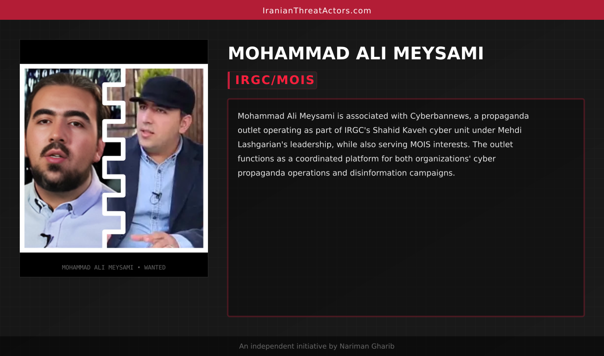 Mohammad Ali Meysami is associated with Cyberbannews, a propaganda outlet operating as part of IRGC's Shahid Kaveh cyber unit under Mehdi Lashgarian's leadership, while also serving MOIS interests. The outlet functions as a coordinated platform for both organizations' cyber propaganda operations and disinformation campaigns.