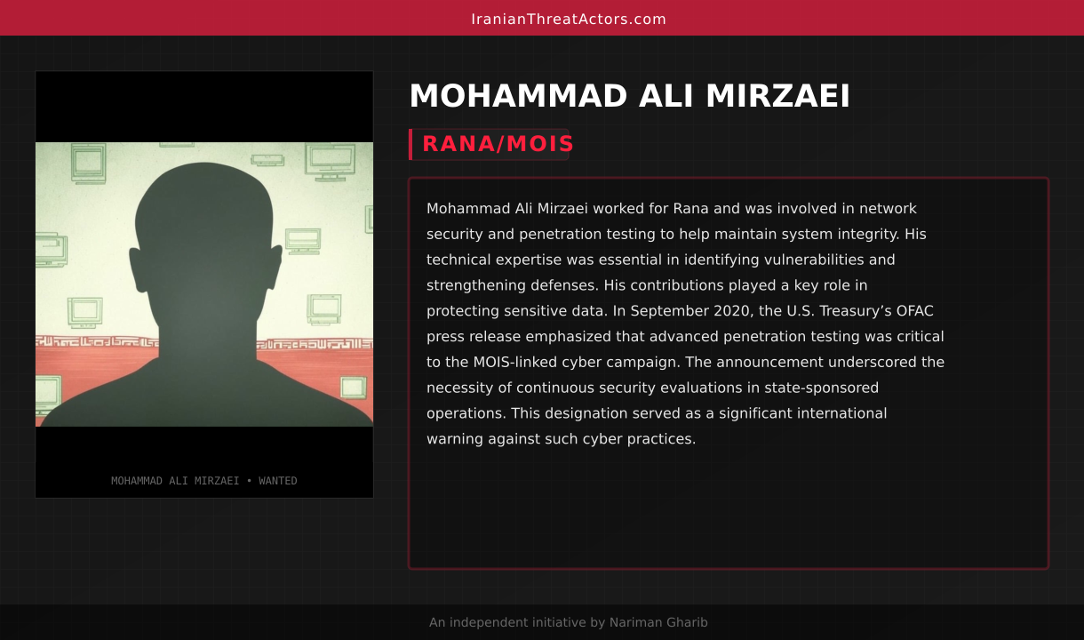Mohammad Ali Mirzaei worked for Rana and was involved in network security and penetration testing to help maintain system integrity. His technical expertise was essential in identifying vulnerabilities and strengthening defenses. His contributions played a key role in protecting sensitive data. In September 2020, the U.S. Treasury’s OFAC press release emphasized that advanced penetration testing was critical to the MOIS-linked cyber campaign. The announcement underscored the necessity of continuous security evaluations in state-sponsored operations. This designation served as a significant international warning against such cyber practices.