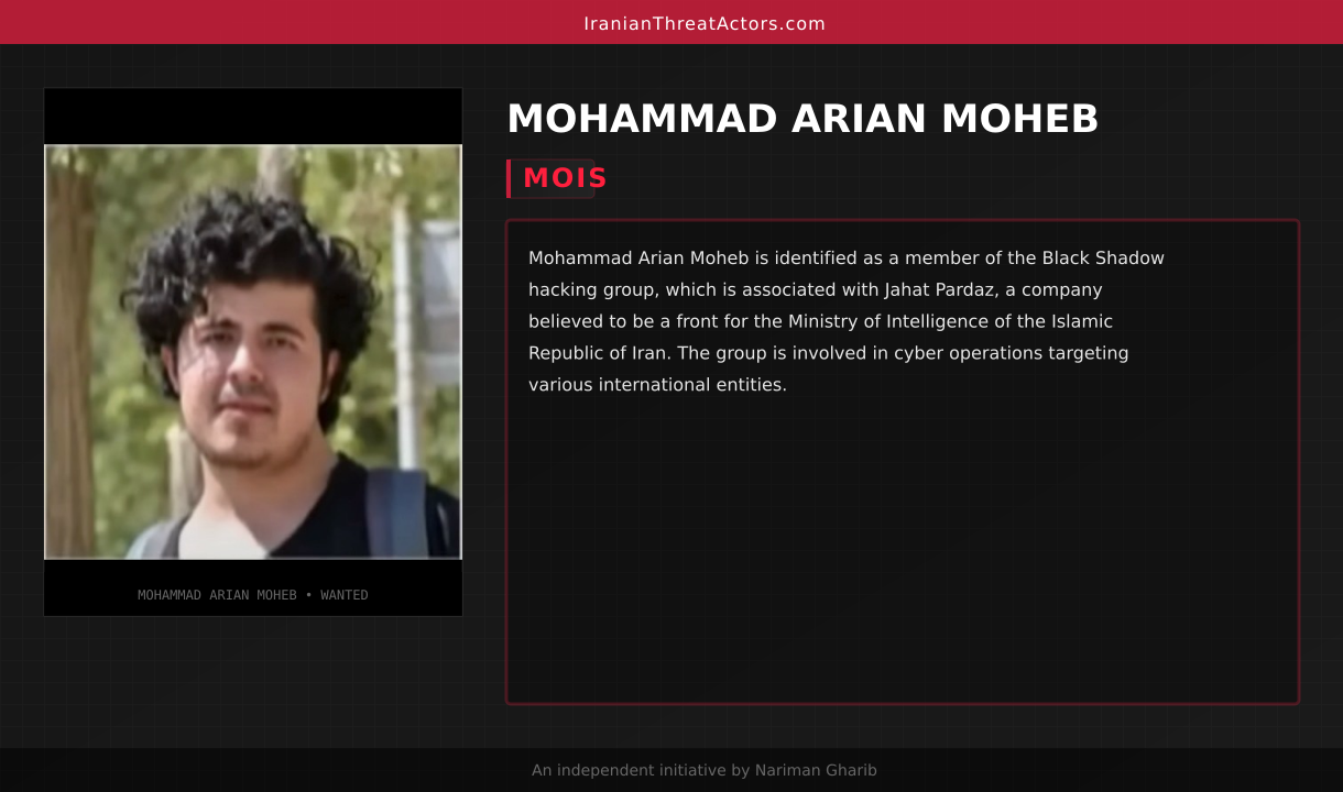 Mohammad Arian Moheb is identified as a member of the Black Shadow hacking group, which is associated with Jahat Pardaz, a company believed to be a front for the Ministry of Intelligence of the Islamic Republic of Iran. The group is involved in cyber operations targeting various international entities.