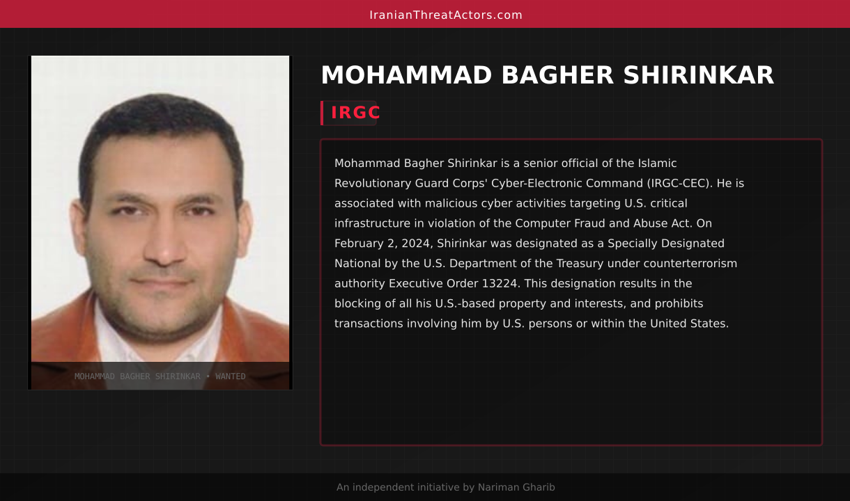 Mohammad Bagher Shirinkar is a senior official of the Islamic Revolutionary Guard Corps' Cyber-Electronic Command (IRGC-CEC). He maintains a close working relationship with Fatemeh Sedighian Kashi, coordinating cyber operations targeting U.S. elections, critical infrastructure, and businesses through the IRGC cyber unit known as Shahid Shushtari (previously known as Emennet Pasargad, Aria Sepehr Ayandehsazan, Eeleyanet Gostar, and Net Peygard Samavat Company). Shahid Shushtari members have caused significant financial damage and disruption to U.S. businesses and government agencies through coordinated cyber and cyber-enabled information operations targeting multiple critical infrastructure sectors including news, shipping, travel, energy, financial, and telecommunications in the United States, Europe, and the Middle East. The group is connected to CyberAv3ngers, which utilized IOCONTROL malware to target worldwide ICS/SCADA devices. In August 2020, Shahid Shushtari actors began a multi-faceted campaign targeting the U.S. presidential election. On February 2, 2024, Shirinkar was designated as a Specially Designated National by the U.S. Department of the Treasury under counterterrorism authority Executive Order 13224. The U.S. government is offering a reward of up to $10 million for information leading to his identification or location.