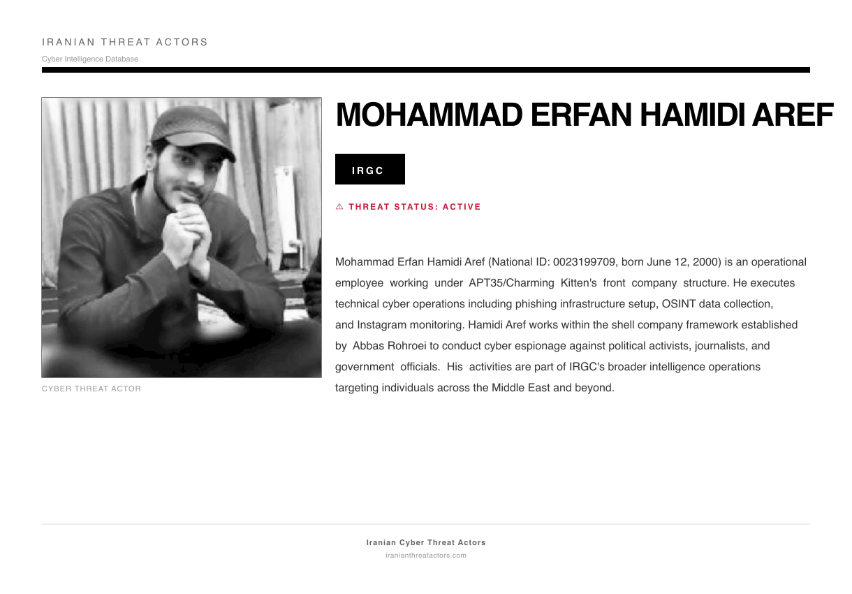 Mohammad Erfan Hamidi Aref (National ID: 0023199709, born June 12, 2000) is an operational employee working under APT35/Charming Kitten's front company structure. He executes technical cyber operations including phishing infrastructure setup, OSINT data collection, and Instagram monitoring. Hamidi Aref works within the shell company framework established by Abbas Rohroei to conduct cyber espionage against political activists, journalists, and government officials. His activities are part of IRGC's broader intelligence operations targeting individuals across the Middle East and beyond.