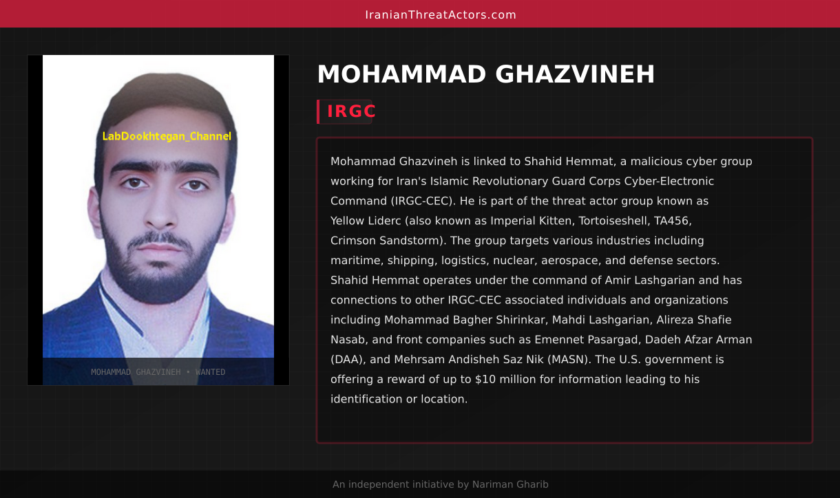 Mohammad Ghazvineh is linked to Shahid Hemmat, a malicious cyber group working for Iran's Islamic Revolutionary Guard Corps Cyber-Electronic Command (IRGC-CEC). He is part of the threat actor group known as Yellow Liderc (also known as Imperial Kitten, Tortoiseshell, TA456, Crimson Sandstorm). The group targets various industries including maritime, shipping, logistics, nuclear, aerospace, and defense sectors. Shahid Hemmat operates under the command of Amir Lashgarian and has connections to other IRGC-CEC associated individuals and organizations including Mohammad Bagher Shirinkar, Mahdi Lashgarian, Alireza Shafie Nasab, and front companies such as Emennet Pasargad, Dadeh Afzar Arman (DAA), and Mehrsam Andisheh Saz Nik (MASN). The U.S. government is offering a reward of up to $10 million for information leading to his identification or location.