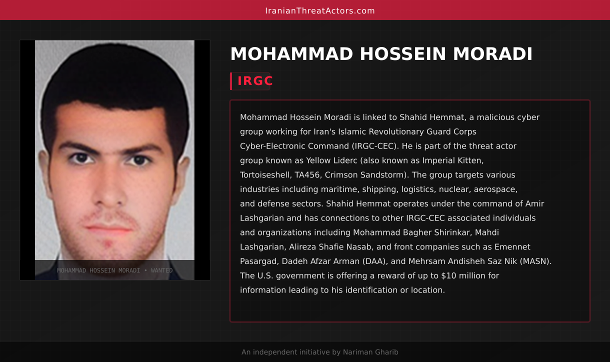 Mohammad Hossein Moradi is linked to Shahid Hemmat, a malicious cyber group working for Iran's Islamic Revolutionary Guard Corps Cyber-Electronic Command (IRGC-CEC). He is part of the threat actor group known as Yellow Liderc (also known as Imperial Kitten, Tortoiseshell, TA456, Crimson Sandstorm). The group targets various industries including maritime, shipping, logistics, nuclear, aerospace, and defense sectors. Shahid Hemmat operates under the command of Amir Lashgarian and has connections to other IRGC-CEC associated individuals and organizations including Mohammad Bagher Shirinkar, Mahdi Lashgarian, Alireza Shafie Nasab, and front companies such as Emennet Pasargad, Dadeh Afzar Arman (DAA), and Mehrsam Andisheh Saz Nik (MASN). The U.S. government is offering a reward of up to $10 million for information leading to his identification or location.