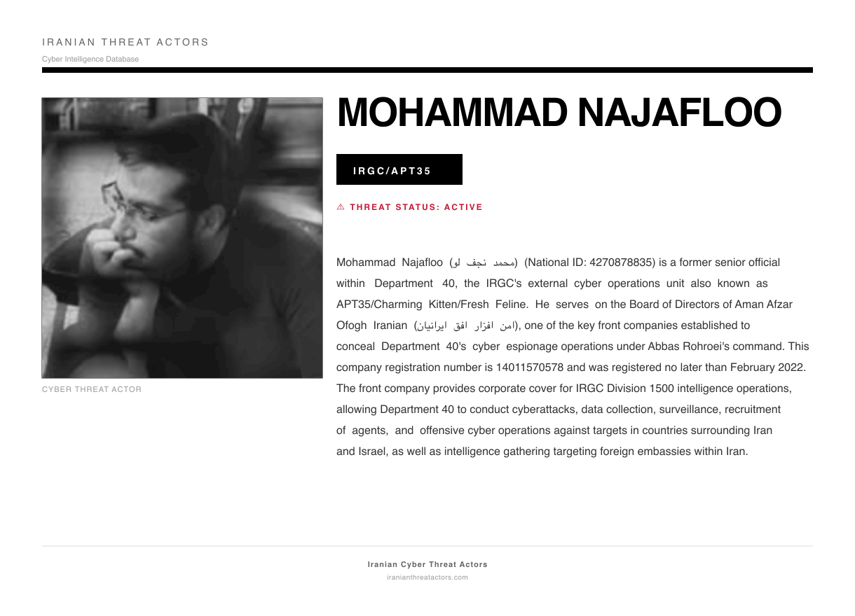Mohammad Najafloo (محمد نجف لو) (National ID: 4270878835) is a former senior official within Department 40, the IRGC's external cyber operations unit also known as APT35/Charming Kitten/Fresh Feline. He serves on the Board of Directors of Aman Afzar Ofogh Iranian (امن افزار افق ایرانیان), one of the key front companies established to conceal Department 40's cyber espionage operations under Abbas Rohroei's command. This company registration number is 14011570578 and was registered no later than February 2022. The front company provides corporate cover for IRGC Division 1500 intelligence operations, allowing Department 40 to conduct cyberattacks, data collection, surveillance, recruitment of agents, and offensive cyber operations against targets in countries surrounding Iran and Israel, as well as intelligence gathering targeting foreign embassies within Iran.