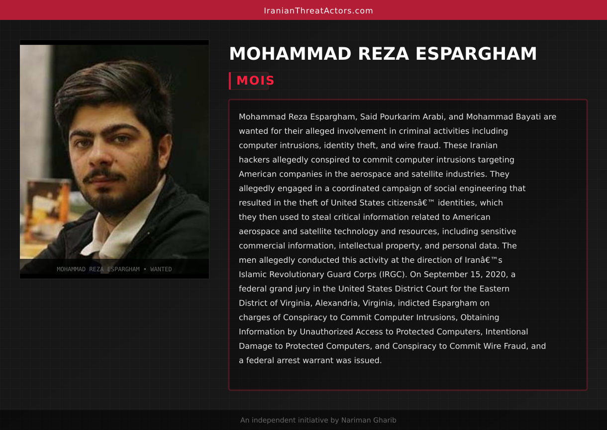 Mohammad Reza Espargham, Said Pourkarim Arabi, and Mohammad Bayati are wanted for their alleged involvement in criminal activities including computer intrusions, identity theft, and wire fraud. These Iranian hackers allegedly conspired to commit computer intrusions targeting American companies in the aerospace and satellite industries. They allegedly engaged in a coordinated campaign of social engineering that resulted in the theft of United States citizens’ identities, which they then used to steal critical information related to American aerospace and satellite technology and resources, including sensitive commercial information, intellectual property, and personal data. The men allegedly conducted this activity at the direction of Iran’s Islamic Revolutionary Guard Corps (IRGC). On September 15, 2020, a federal grand jury in the United States District Court for the Eastern District of Virginia, Alexandria, Virginia, indicted Espargham on charges of Conspiracy to Commit Computer Intrusions, Obtaining Information by Unauthorized Access to Protected Computers, Intentional Damage to Protected Computers, and Conspiracy to Commit Wire Fraud, and a federal arrest warrant was issued.