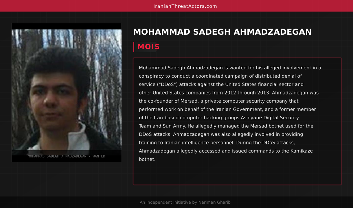 Mohammad Sadegh Ahmadzadegan is wanted for his alleged involvement in a conspiracy to conduct a coordinated campaign of distributed denial of service ("DDoS") attacks against the United States financial sector and other United States companies from 2012 through 2013. Ahmadzadegan was the co-founder of Mersad, a private computer security company that performed work on behalf of the Iranian Government, and a former member of the Iran-based computer hacking groups Ashiyane Digital Security Team and Sun Army. He allegedly managed the Mersad botnet used for the DDoS attacks. Ahmadzadegan was also allegedly involved in providing training to Iranian intelligence personnel. During the DDoS attacks, Ahmadzadegan allegedly accessed and issued commands to the Kamikaze botnet.