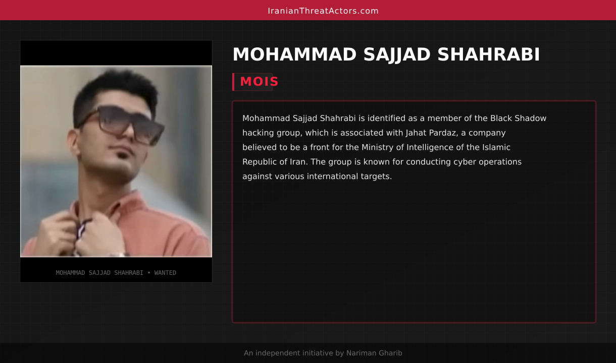 Mohammad Sajjad Shahrabi is identified as a member of the Black Shadow hacking group, which is associated with Jahat Pardaz, a company believed to be a front for the Ministry of Intelligence of the Islamic Republic of Iran. The group is known for conducting cyber operations against various international targets.