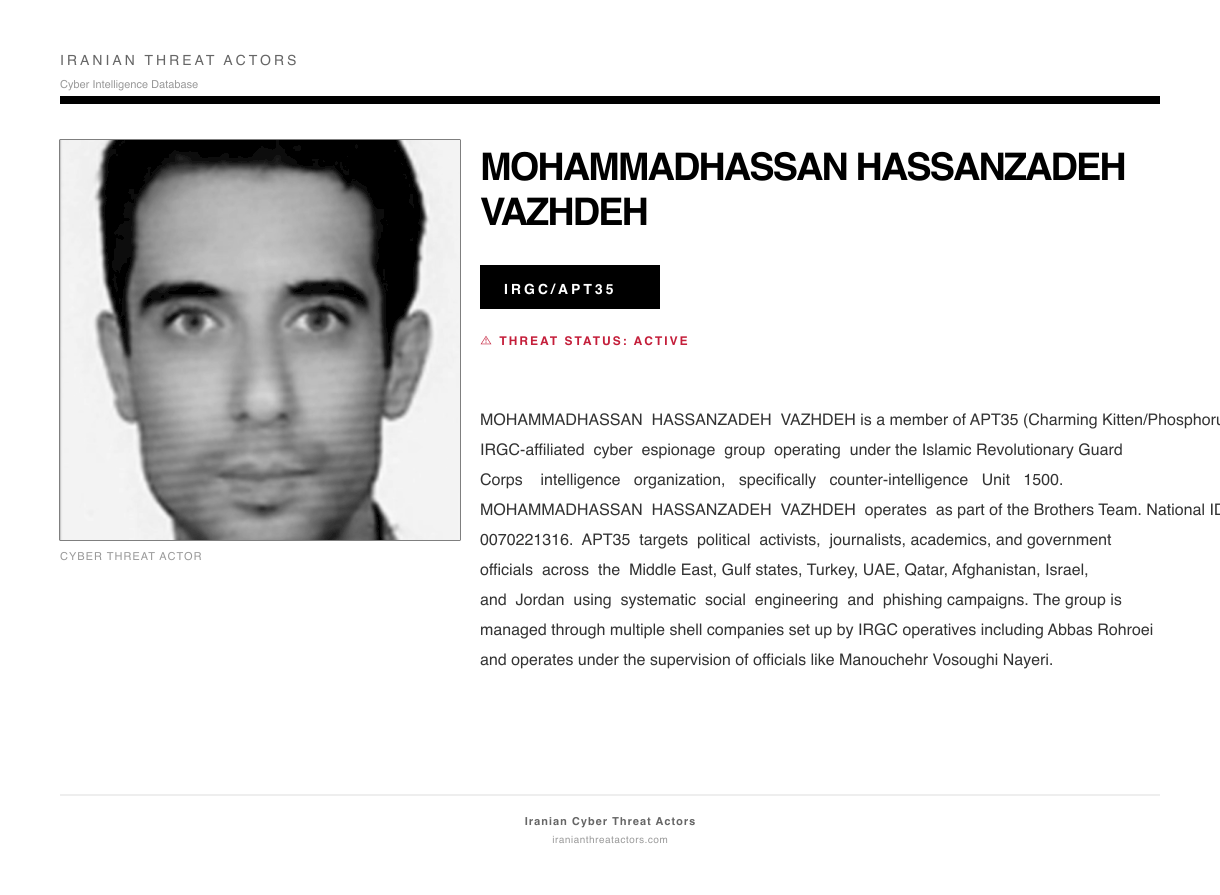 MOHAMMADHASSAN HASSANZADEH VAZHDEH is a member of APT35 (Charming Kitten/Phosphorus), an IRGC-affiliated cyber espionage group operating under the Islamic Revolutionary Guard Corps intelligence organization, specifically counter-intelligence Unit 1500. MOHAMMADHASSAN HASSANZADEH VAZHDEH operates as part of the Brothers Team. National ID: 0070221316. APT35 targets political activists, journalists, academics, and government officials across the Middle East, Gulf states, Turkey, UAE, Qatar, Afghanistan, Israel, and Jordan using systematic social engineering and phishing campaigns. The group is managed through multiple shell companies set up by IRGC operatives including Abbas Rohroei and operates under the supervision of officials like Manouchehr Vosoughi Nayeri.