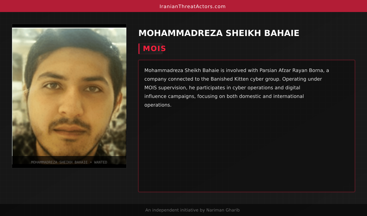 Mohammadreza Sheikh Bahaie is involved with Parsian Afzar Rayan Borna, a company connected to the Banished Kitten cyber group. Operating under MOIS supervision, he participates in cyber operations and digital influence campaigns, focusing on both domestic and international operations.