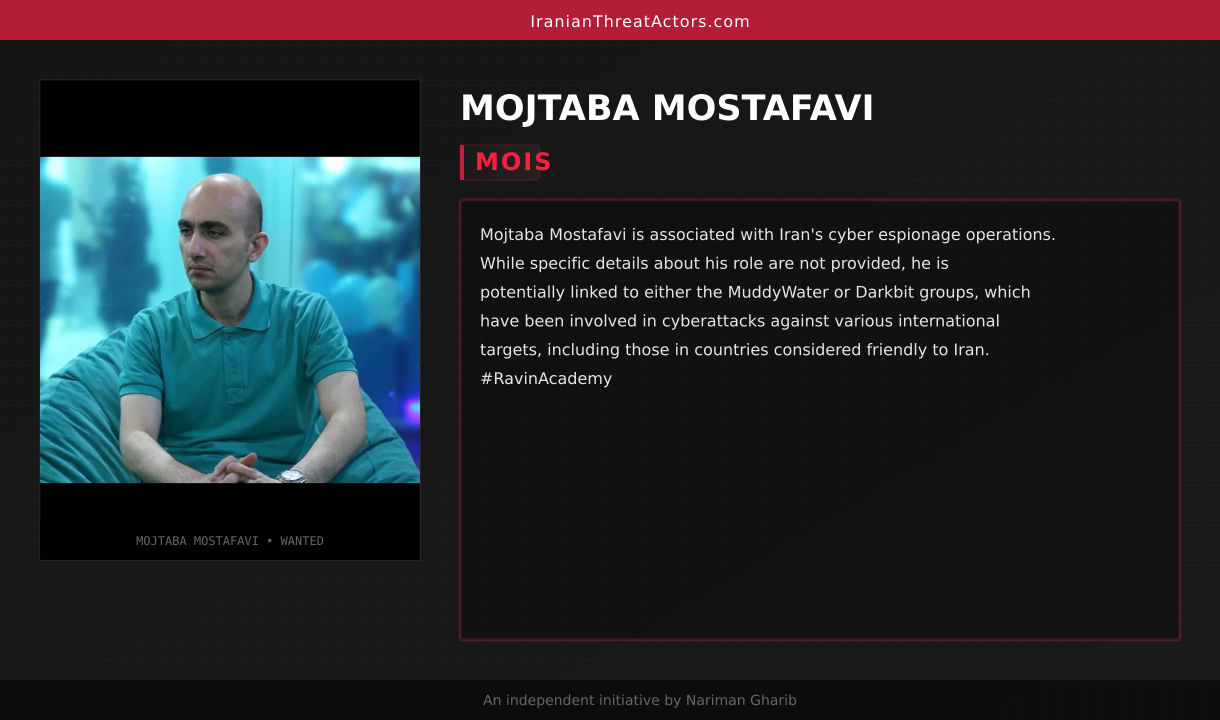 Mojtaba Mostafavi is associated with Iran's cyber espionage operations. While specific details about his role are not provided, he is potentially linked to either the MuddyWater or Darkbit groups, which have been involved in cyberattacks against various international targets, including those in countries considered friendly to Iran. #RavinAcademy