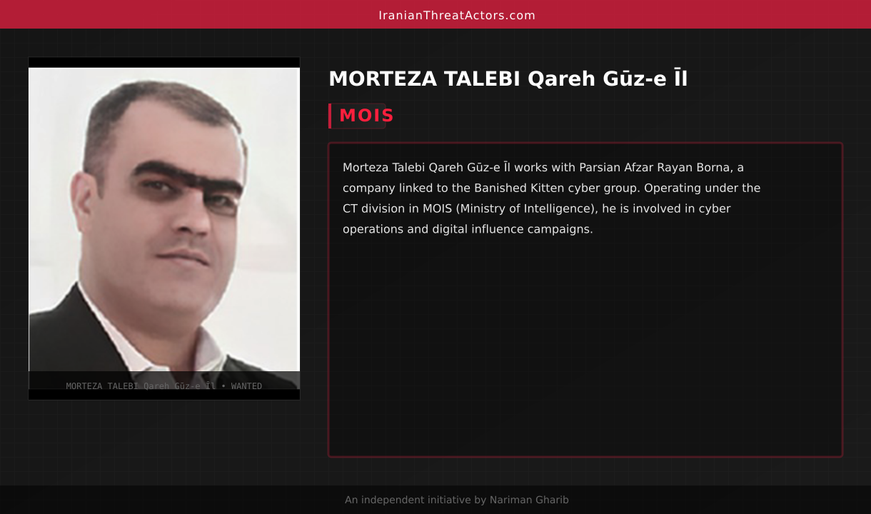 Morteza Talebi Qareh Gūz-e Īl works with Parsian Afzar Rayan Borna, a company linked to the Banished Kitten cyber group. Operating under the CT division in MOIS (Ministry of Intelligence), he is involved in cyber operations and digital influence campaigns.