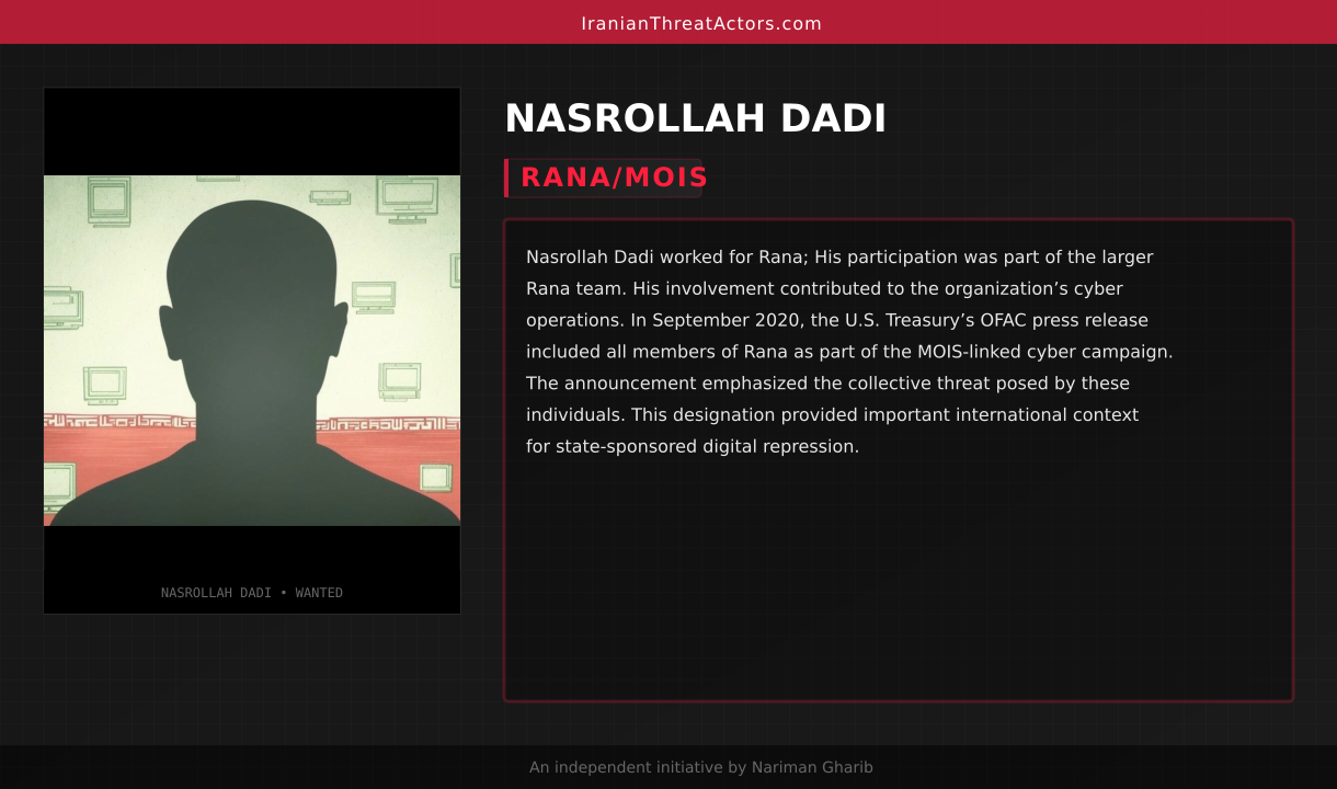 Nasrollah Dadi worked for Rana; His participation was part of the larger Rana team. His involvement contributed to the organization’s cyber operations. In September 2020, the U.S. Treasury’s OFAC press release included all members of Rana as part of the MOIS-linked cyber campaign. The announcement emphasized the collective threat posed by these individuals. This designation provided important international context for state-sponsored digital repression.