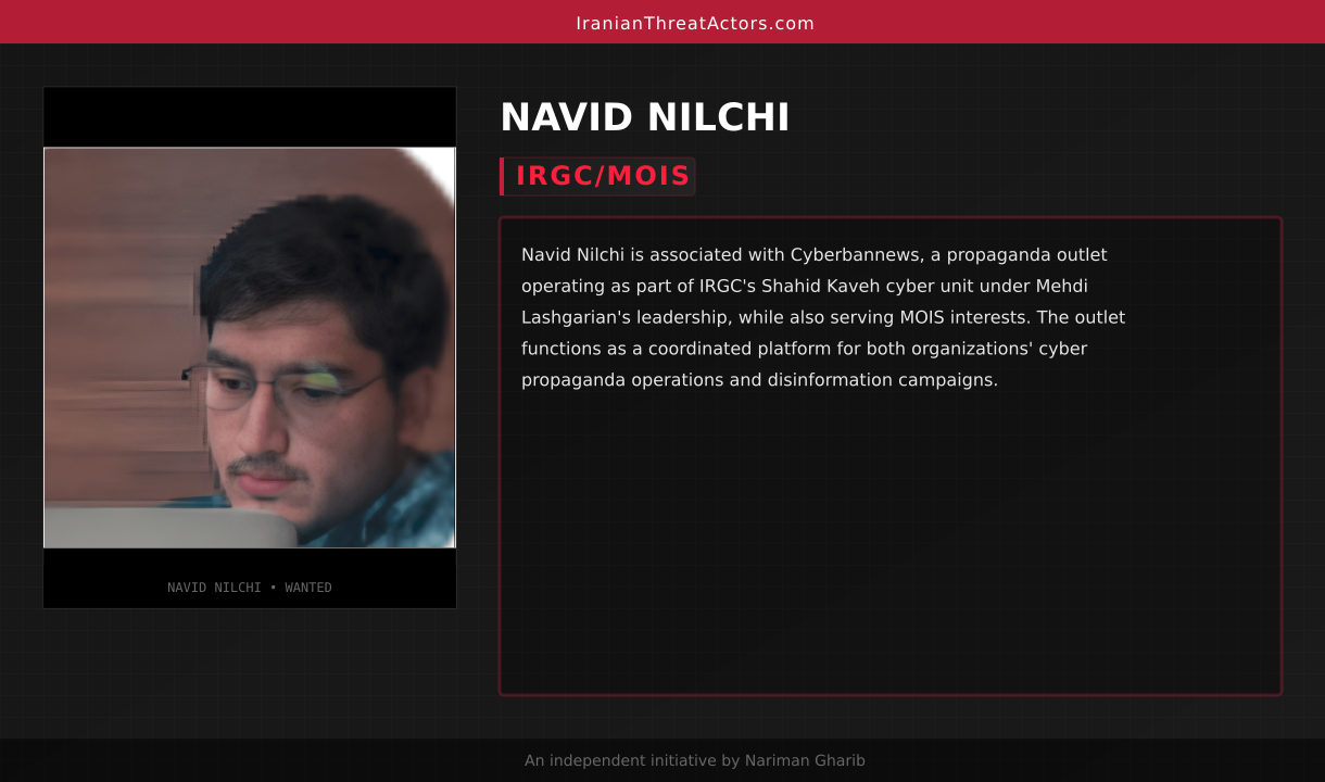 Navid Nilchi is associated with Cyberbannews, a propaganda outlet operating as part of IRGC's Shahid Kaveh cyber unit under Mehdi Lashgarian's leadership, while also serving MOIS interests. The outlet functions as a coordinated platform for both organizations' cyber propaganda operations and disinformation campaigns.