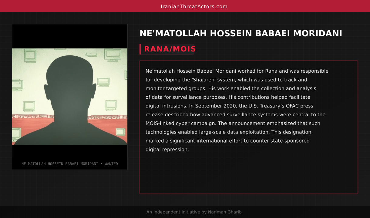 Ne'matollah Hossein Babaei Moridani worked for Rana and was responsible for developing the 'Shajareh' system, which was used to track and monitor targeted groups. His work enabled the collection and analysis of data for surveillance purposes. His contributions helped facilitate digital intrusions. In September 2020, the U.S. Treasury’s OFAC press release described how advanced surveillance systems were central to the MOIS-linked cyber campaign. The announcement emphasized that such technologies enabled large-scale data exploitation. This designation marked a significant international effort to counter state-sponsored digital repression.