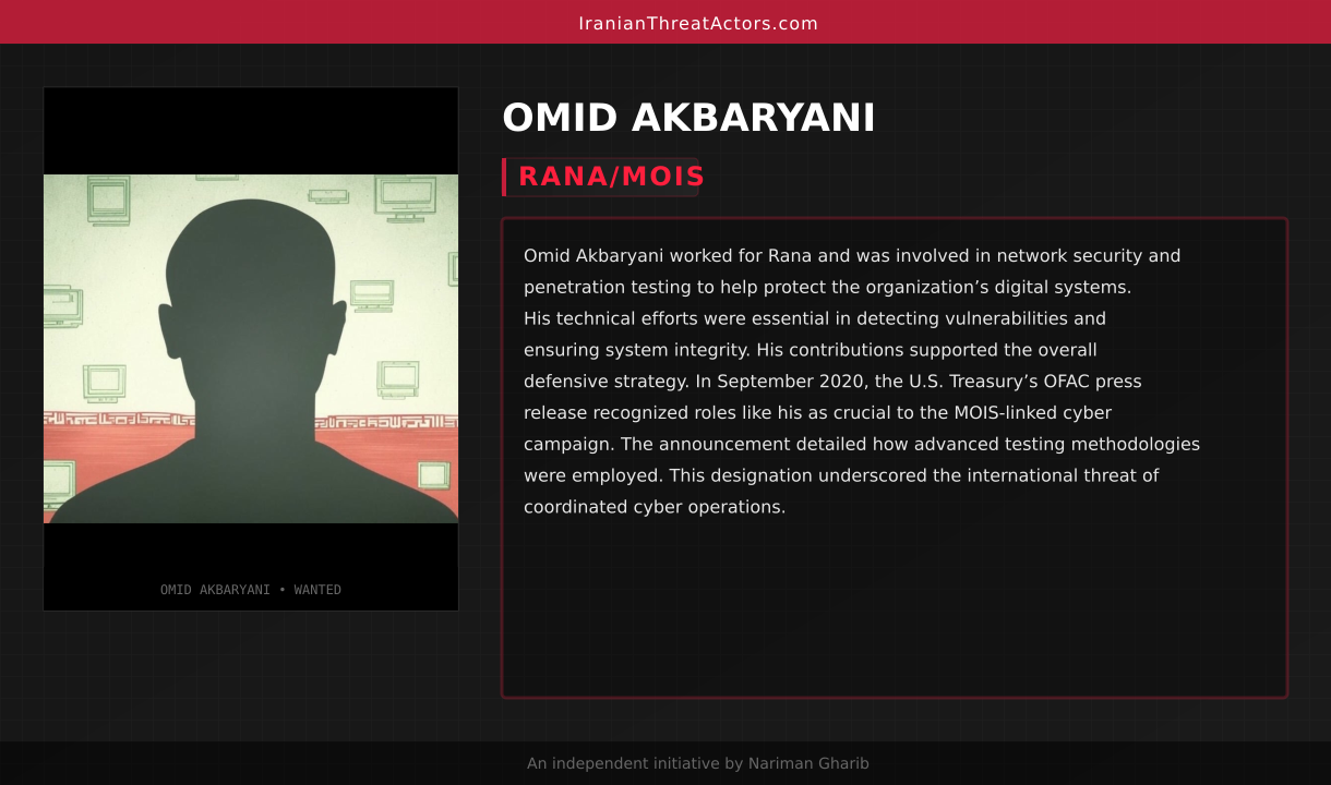 Omid Akbaryani worked for Rana and was involved in network security and penetration testing to help protect the organization’s digital systems. His technical efforts were essential in detecting vulnerabilities and ensuring system integrity. His contributions supported the overall defensive strategy. In September 2020, the U.S. Treasury’s OFAC press release recognized roles like his as crucial to the MOIS-linked cyber campaign. The announcement detailed how advanced testing methodologies were employed. This designation underscored the international threat of coordinated cyber operations.