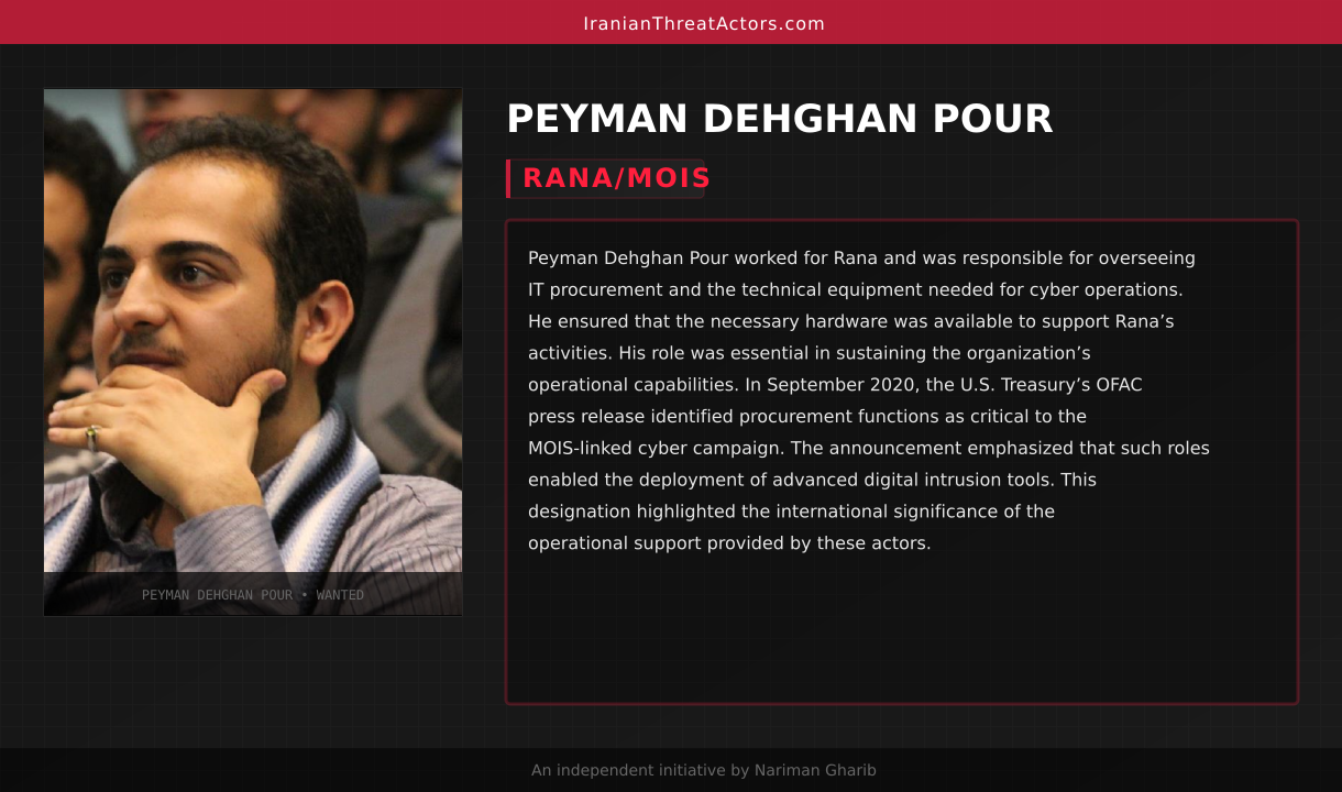 Peyman Dehghan Pour worked for Rana and was responsible for overseeing IT procurement and the technical equipment needed for cyber operations. He ensured that the necessary hardware was available to support Rana’s activities. His role was essential in sustaining the organization’s operational capabilities. In September 2020, the U.S. Treasury’s OFAC press release identified procurement functions as critical to the MOIS-linked cyber campaign. The announcement emphasized that such roles enabled the deployment of advanced digital intrusion tools. This designation highlighted the international significance of the operational support provided by these actors.