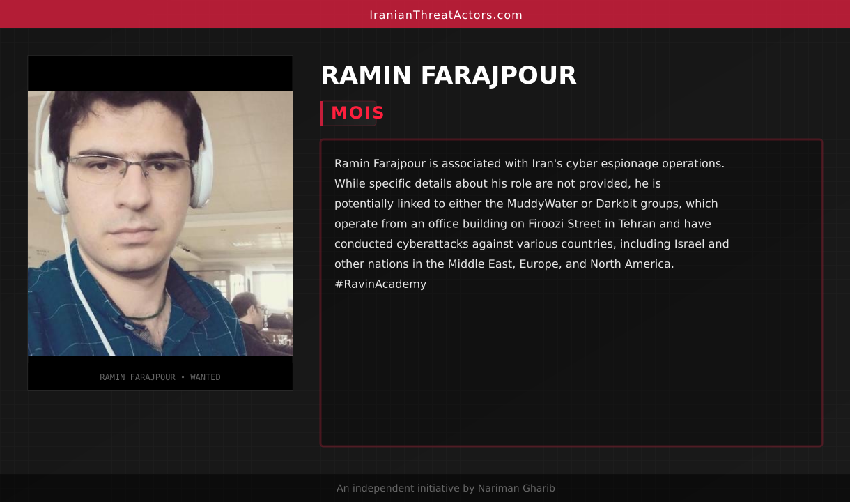 Ramin Farajpour is associated with Iran's cyber espionage operations. While specific details about his role are not provided, he is potentially linked to either the MuddyWater or Darkbit groups, which operate from an office building on Firoozi Street in Tehran and have conducted cyberattacks against various countries, including Israel and other nations in the Middle East, Europe, and North America. #RavinAcademy
