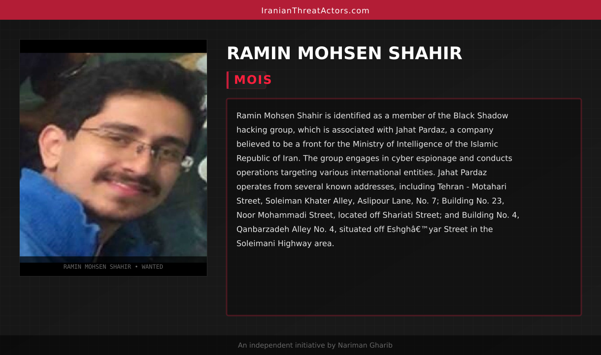 Ramin Mohsen Shahir is identified as a member of the Black Shadow hacking group, which is associated with Jahat Pardaz, a company believed to be a front for the Ministry of Intelligence of the Islamic Republic of Iran. The group engages in cyber espionage and conducts operations targeting various international entities. Jahat Pardaz operates from several known addresses, including Tehran - Motahari Street, Soleiman Khater Alley, Aslipour Lane, No. 7; Building No. 23, Noor Mohammadi Street, located off Shariati Street; and Building No. 4, Qanbarzadeh Alley No. 4, situated off Eshgh’yar Street in the Soleimani Highway area.