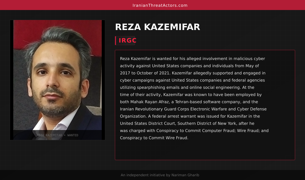 Reza Kazemifar is wanted for his alleged involvement in malicious cyber activity against United States companies and individuals from May of 2017 to October of 2021. Kazemifar allegedly supported and engaged in cyber campaigns against United States companies and federal agencies utilizing spearphishing emails and online social engineering. At the time of their activity, Kazemifar was known to have been employed by both Mahak Rayan Afraz, a Tehran-based software company, and the Iranian Revolutionary Guard Corps Electronic Warfare and Cyber Defense Organization. A federal arrest warrant was issued for Kazemifar in the United States District Court, Southern District of New York, after he was charged with Conspiracy to Commit Computer Fraud; Wire Fraud; and Conspiracy to Commit Wire Fraud.