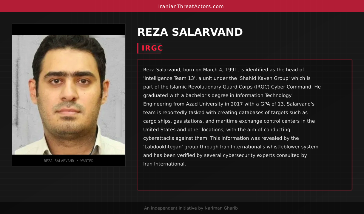 Reza Salarvand, born on March 4, 1991, is identified as the head of 'Intelligence Team 13', a unit under the 'Shahid Kaveh Group' which is part of the Islamic Revolutionary Guard Corps (IRGC) Cyber Command. He graduated with a bachelor's degree in Information Technology Engineering from Azad University in 2017 with a GPA of 13. Salarvand's team is reportedly tasked with creating databases of targets such as cargo ships, gas stations, and maritime exchange control centers in the United States and other locations, with the aim of conducting cyberattacks against them. This information was revealed by the 'Labdookhtegan' group through Iran International's whistleblower system and has been verified by several cybersecurity experts consulted by Iran International.